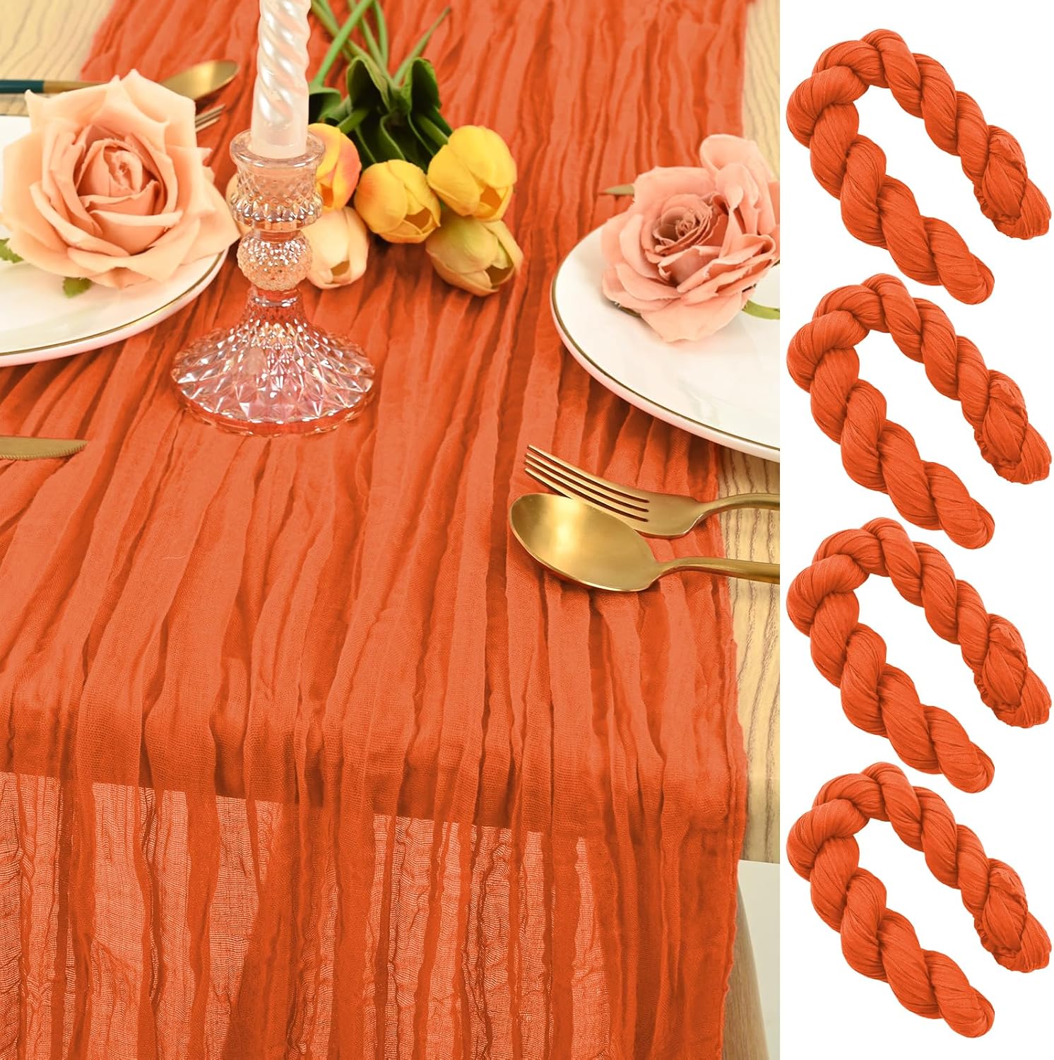 Specification:Quantity: 10 PiecePackage: One Pack of 10 Cheesecloth Table RunnerSize: 35x170 inch /90x430cmSize Fit:Please refer to the product image for the placement effect of different table sizesColor: RedMaterial: 100% PolyesterStyle: Bohemian Romantic RusticFeature:1.Cheesecloth table runner has an elegant appearance with natural wrinkles. It presents a semi transparent visual effect, which is an excellent desktop decoration2.Cheesecloth fabric has many small mesh holes that make it breathable and easy to clean and care.3.This product longer length than other products can support you to create more elegant shapes without constraints. Reminder:☕1.Do not over wash, dry clean, bleach, iron or expose to sunlight to maintain a better user experience and product durability.☕2.Due to differences in screen display, there may be slight differences in color.☕3.If you have any quality issues or misunderstandings with the products you receive, please feel free to contact us at any time to resolve them.