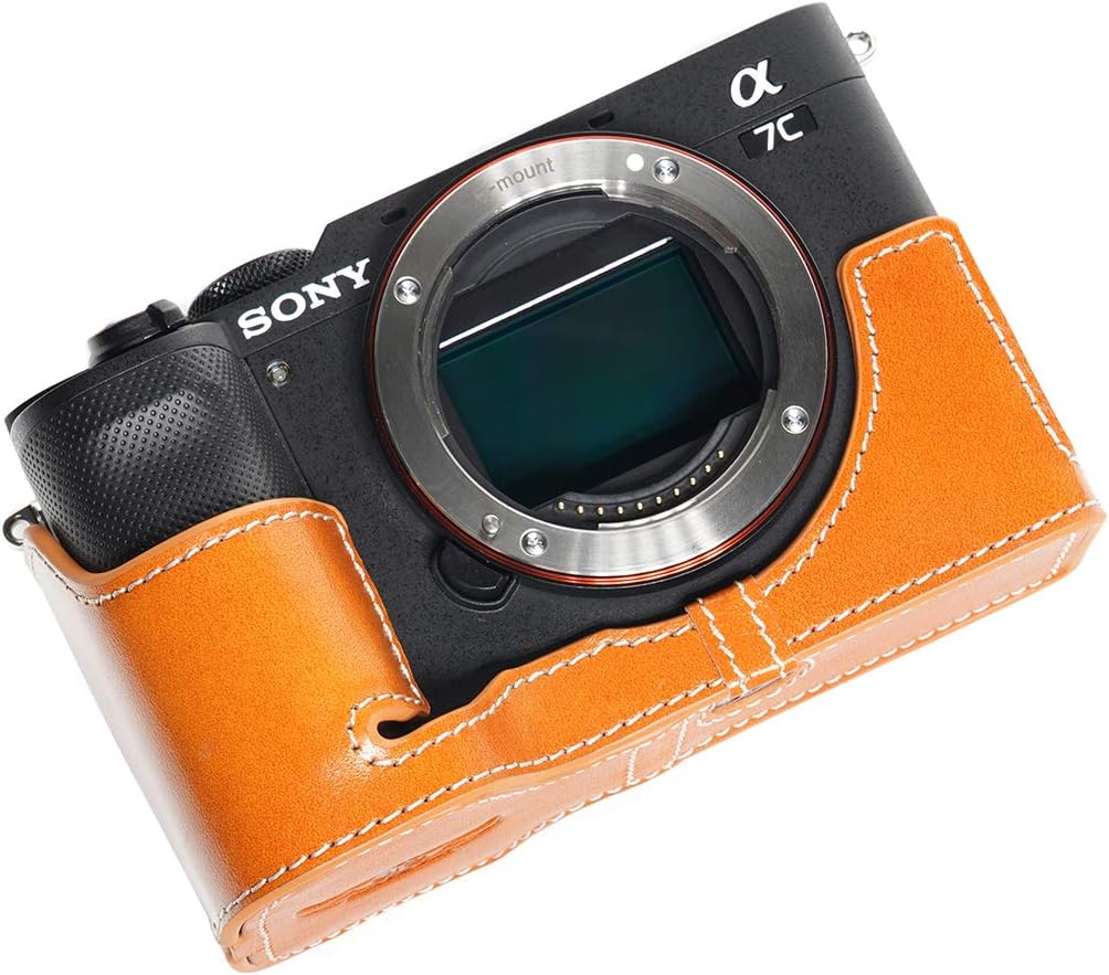 This camera is made by real top layer oil leather, the design is simple and vintage, use Metal sizing techniques make it very fit with the camera body. Inside lining use high lever velvet to protect camera body for scratch and coloration. There is a opening on the bottom for battery, You don't need to take off the half case when you change battery. Under base screw is made by copper and it can easy take off by coin. You don't need to take off the half case when you use tripod. It has a special design for Sony Alpha 7C A7C Camera which makes it easy to turn over the Screen and it will totally not affect screen rotation. You don't need to take off the half case when you connect data lines. Content: 1 x camera half case, 1 x Free Genuine Real Leather Hand Strap, camera not included. Material:Genuine leather.
