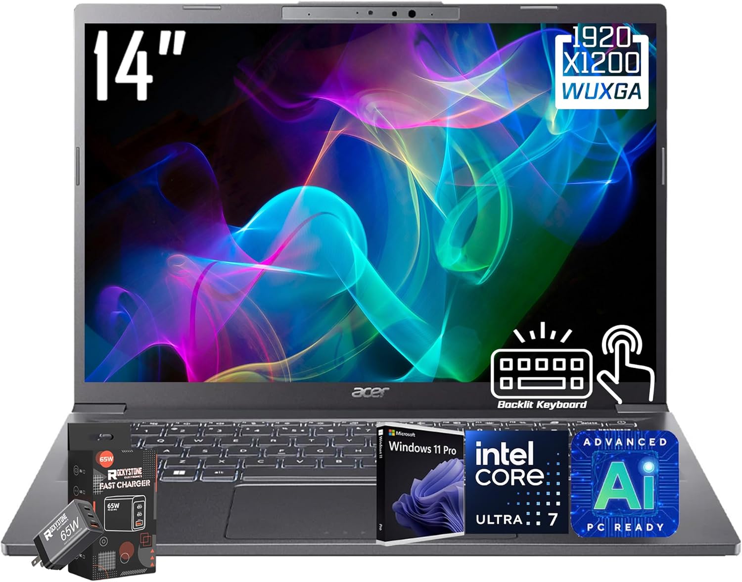 • [Display]: 14.0" Multi-Touch Display with IPS (In-Plane Switching) Technology, WUXGA 1920 x 1200, 100% sRGB, High Brightness (400nits) Acer ComfyView LED-backlit TFT LCD (16:10 Aspect Ratio). This expansive, panoramic screen is your canvas for entertainment, artistic creativity, and captivating AI experiences that will leave you in awe.