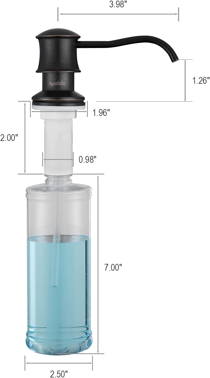 AS94ORB Kitchen faucet Spout Swivel: 360° Sprayer Function: Spray and stream Water Feature: Mixed hot and cold Water Pressure: 3-5 bar Max Flow Rate: 1-4/5 GPMDimensions Overall Height: 17-3/4" Spout Height: 8-3/4" Spout Reach: 9-3/4" Length of Motion Hose: 75" Length of Connecting Hose: 29-1/2" Connection Size: 3/8" Installation Installation: Deck mounted Holes Required: 1 Hole Size: 1-3/8" Max Deck Thickness: 2-1/2"Min Clearance to Backsplash: 3" Package Includes 1 x AguaStella Kitchen faucet 1 x User Manual ASF42ORB soap dispenser Body Material: BrassThe Rest Material: PE plasticNozzle Length: 3.98" / 101 mmBottle Capacity: 16.9 oz / 500 mlInstallationHole Size: 1.02"-1.26" / 26-32 mmMax Deck Thickness: 2"/ 50 mmPackage Includes1 x AguaStella Soap Dispenser1 x Soap Bottle 1 x User Manual