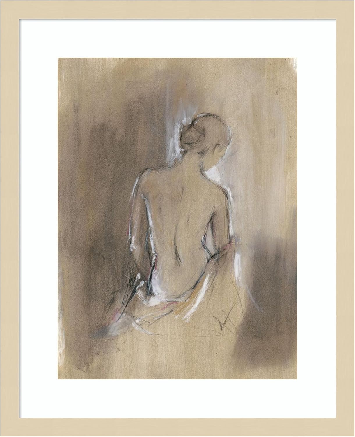 CANVAS ART DETAILS: Embellished Contemporary Figure II by Ethan Harper. ARTIST BIO: Ethan has a Bachelor of Fine Arts from Virginia Commonwealth University and is trained in classical oil painting. This and his illustration background allow him to employ different techniques while encompassing different subject matters. DESCRIPTION: The image depicts a delicate, ethereal sketch of a nude from behind, executed with soft, flowing lines. The color palette is muted, emphasizing gentle contrasts between light and shadow. The composition conveys a sense of serenity and introspection. FRAME: Sylvie Black. OUTER SIZE: 18 in. W x 24 in. H. The Sylvie Black frame features a modern, black float frame with woodgrain textured surfaces and dramatic depth. This Amanti Art canvas art print was created by Ethan Harper and printed by Amanti Art in Waunakee WI. The canvas is stretched by hand and finished with a float frame. Individually made using traditional custom framing techniques, it has the quality you would expect from your local frame shop. Because of our attention to detail and focus on artistry, architects, interior designers, and homeowners alike choose this framed canvas artwork to create beautiful living spaces.