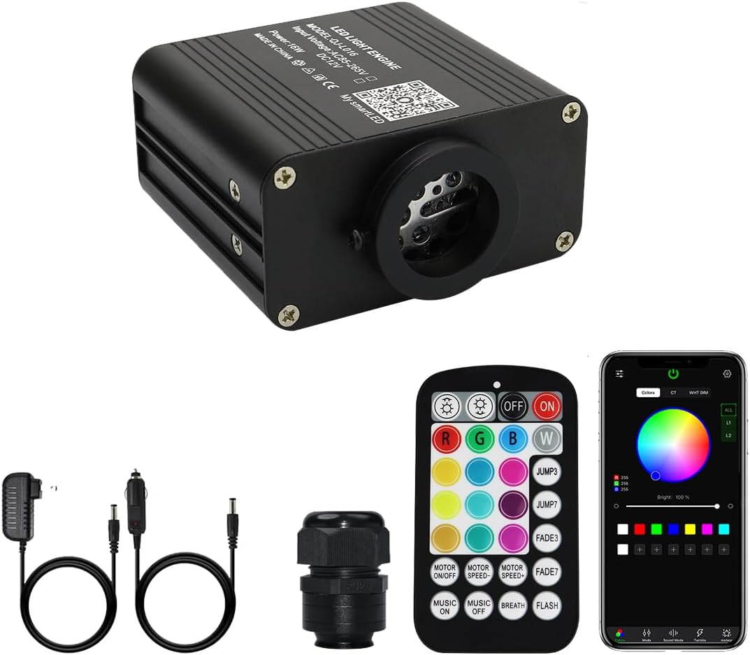 Smart version-APP/Bluetooth controlled Led fiber optic light driver.One light,controlled in two ways ! You could see our product video via link:youtu.be/Bjuvkn6_GWk Technical Specification: Input voltage:AC 110~265V 50/60Hz Power: 16W Control mode: APP,remote&musicRemote type: 28 key RF remote COLOR:RGBW (CREE chip) Light body material: Aluminum Lifetime: up to 50,000 hours Light source device size:L115*W95*H55mm Fiber head inner diameter:20mm Remote dimension: L85*W52*H7mm Warranty: 2 years Package including: 1x 16w RGBW light engine source 1x 28key RF remote controller1x Power adapter 1x Car plug1x User manual [About us] Shine Electronics is a supplier specialized in manufacturing and providing high quality fiber optic lights kit. We support customized fiber optics lights. No charge for customization!How to download APP? 1.Download APP with your smartphone: My SmartLED;2.Both Android and Apple phones can scan the QR code in the light engine to download the APP;3.If using an Android phone, please download the “MY smart LED” in Google Play;4.If using an Apple phone, please download the “MY smart LED” in the Apple Store.Note:Battery included: NOTwinkle function:NO