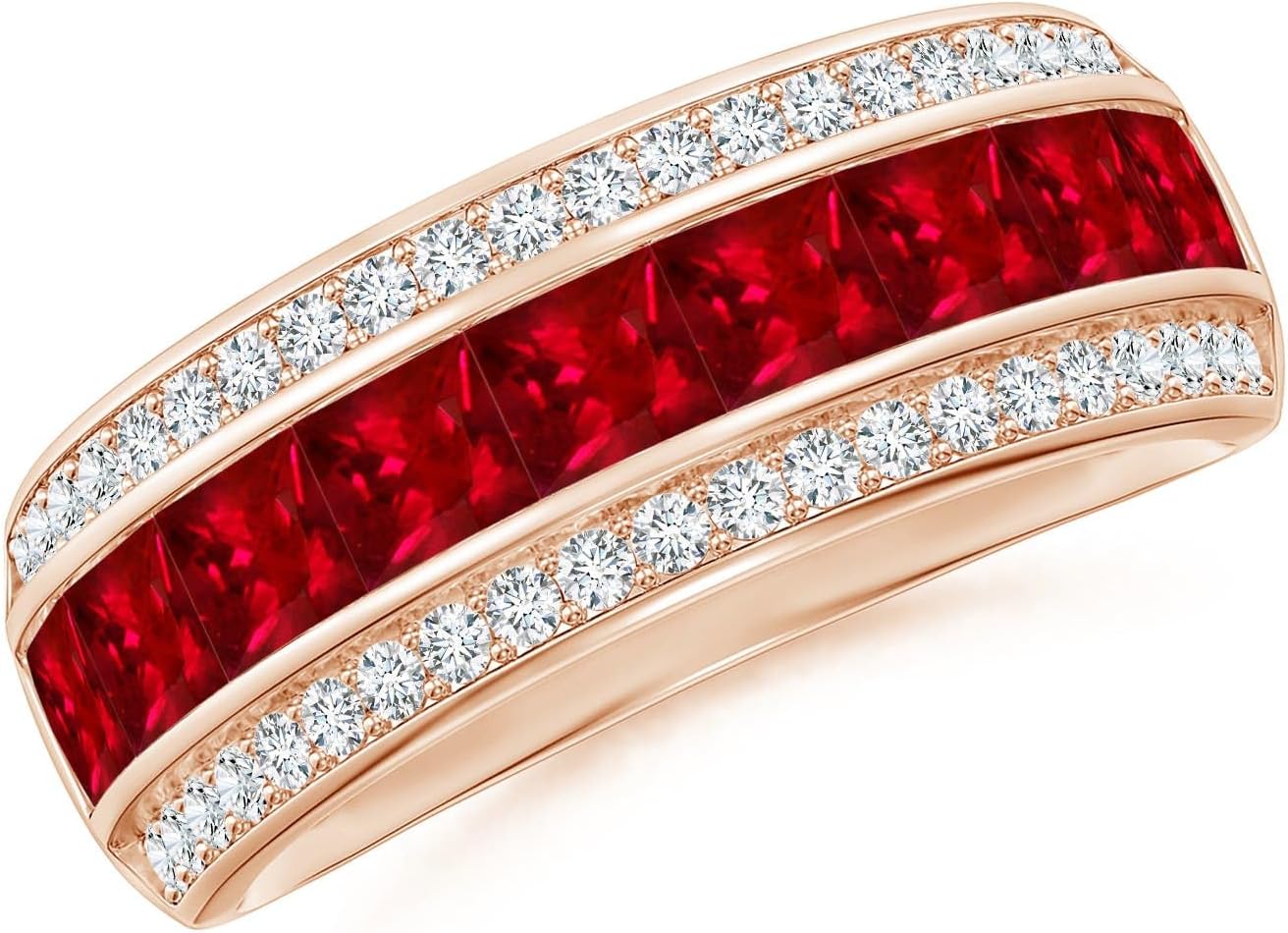 Arranged in a half eternity pattern are square rubies, accompanied with brilliant diamonds. The rich red gems are channel-set while the diamonds are pave set in a railroad pattern on this beautiful platinum band.