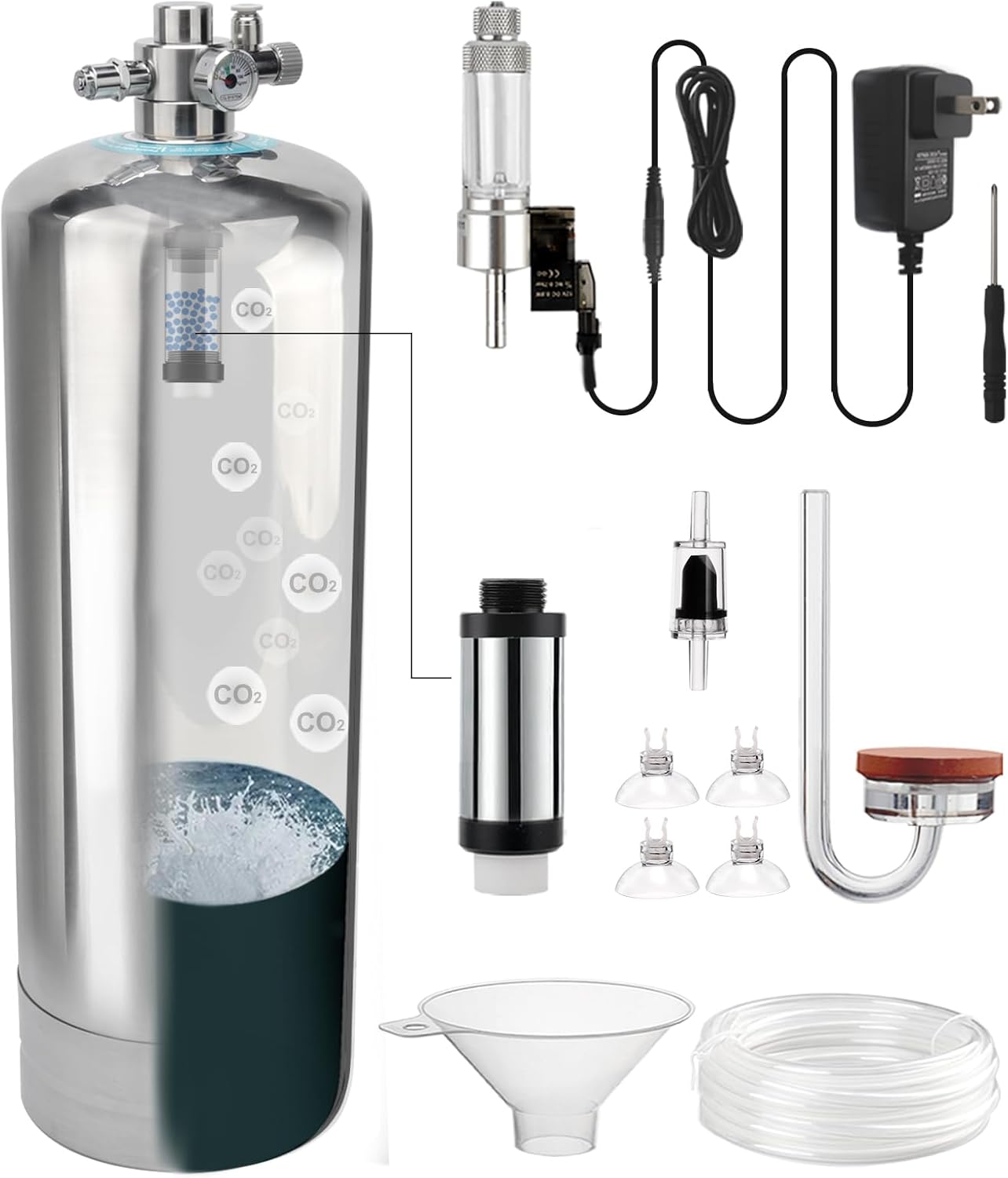 | Directions | RAW MATERIALS: 400g citric acid +400g baking soda + 600ml water = CO2 (Pressure≈45kg/cm²) NOTE: For Safe Use: Do not exceed the recommended amount of raw materials and don't add other raw materials! Better to change the water in the bubble counter every week to prevent crystals from blocking the check valve or solenoid valve. Recommended to use with a CO2 drop checker (not included). All other details are listed in the manual, please read it carefully before installation. PACKAGE INCLUDED: 1 x generator cylinder 1 x CO2 regulator (with safety valve and needle valve) 1 x bubble counter with solenoid valve 1 x filter 1 x leadwire 1 x power adapter 1 x screwdriver 1 x 2m/6.6ft CO2 tubing 1 x diffuser 1 x 5mm suction cup 3 x 6mm suction cup 1 x check valve 2 x funnel 1 x base stand 1 x user manual |