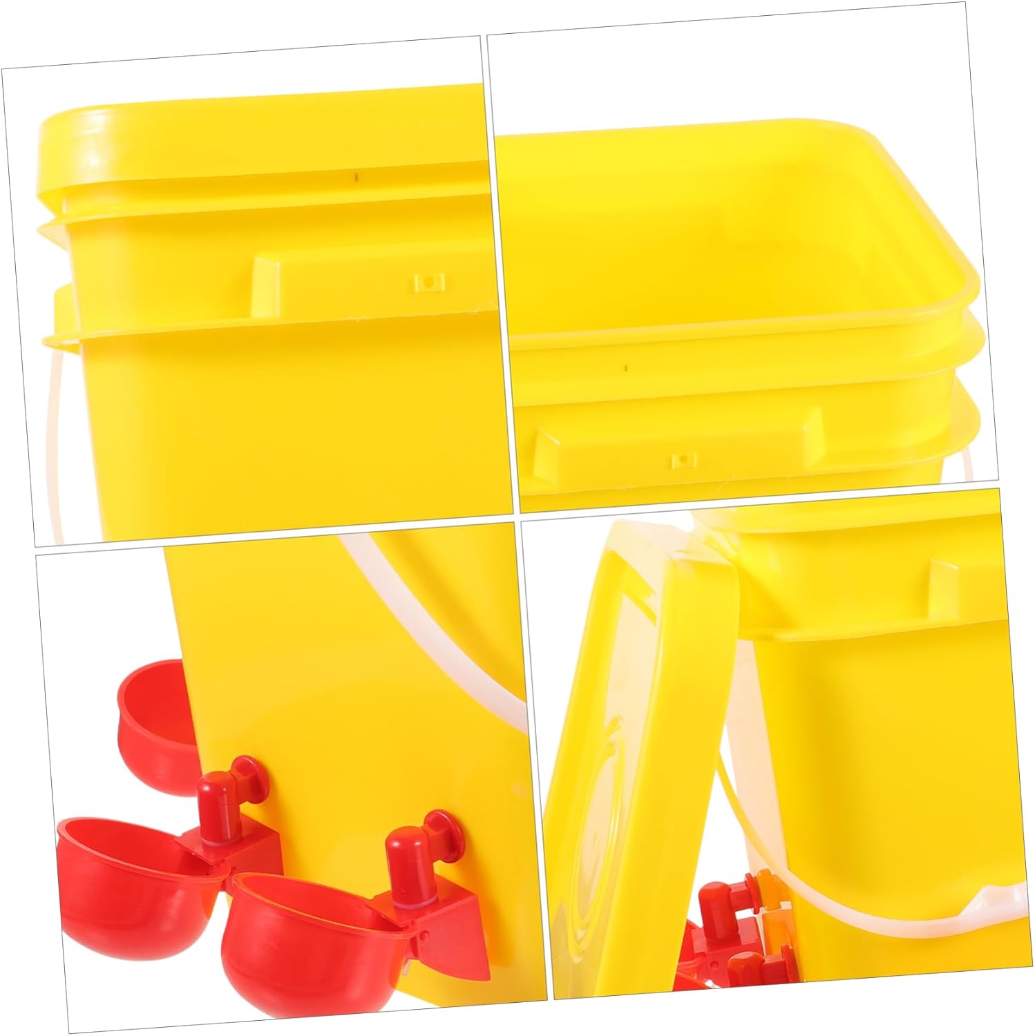 Package List 1 x bucket 8 x chick watering bowl Features -Capacity:12L poultry feeding container -Color:Yellow feeder -Size:29.00X25.00X22.00cm/11.40X9.82X8.65in plastic chicken feeder -Material:PE poultry supplies - and multi-functional, the food feeder can hold both dry and wet food. It is effective in food from getting dirty and is easy to use and clean chicken food feeder. - A , clean, simple and convenient way to provide feed for poultry brings great convenience chicken feeder kit. - It has a simple design, but very in use, giving you a chick feeder. - Easy to clean and wash, the poultry food feeder is very simple to fill and use, convenient and feeder. - Food feeder can be placed stably and easily, and will not occupy too much space, very simple and useful chicken feeding container.Goods Informationplastic chicken feeder Easy and convenient to use, professional design for poultry.chicken food feeder With this item, it can bring much convenience to you.chicken feeding supplies They are creative and to use.reusable chick feeder Suitable for chicken, or some other poultry, with anti-splash.poultry feeding container There is a chick feeder, which is made of PE material, and reusable for use