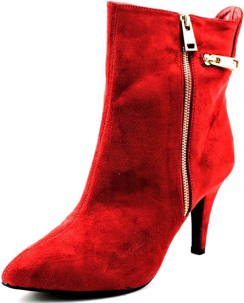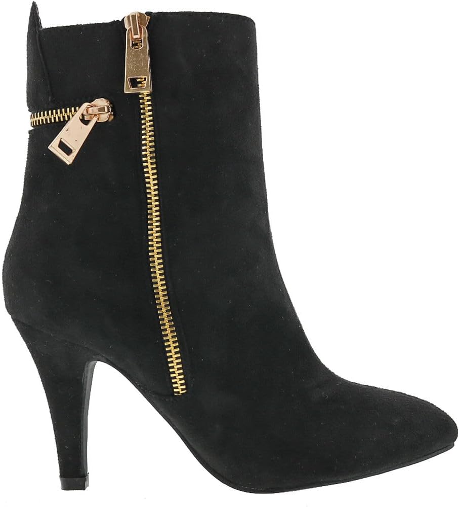 Sassy boots add zip to your wardrobe with decorative horizontal and vertical gold tone zippers at the back and outer side. This dressy ankle boot zips for easy on and off.