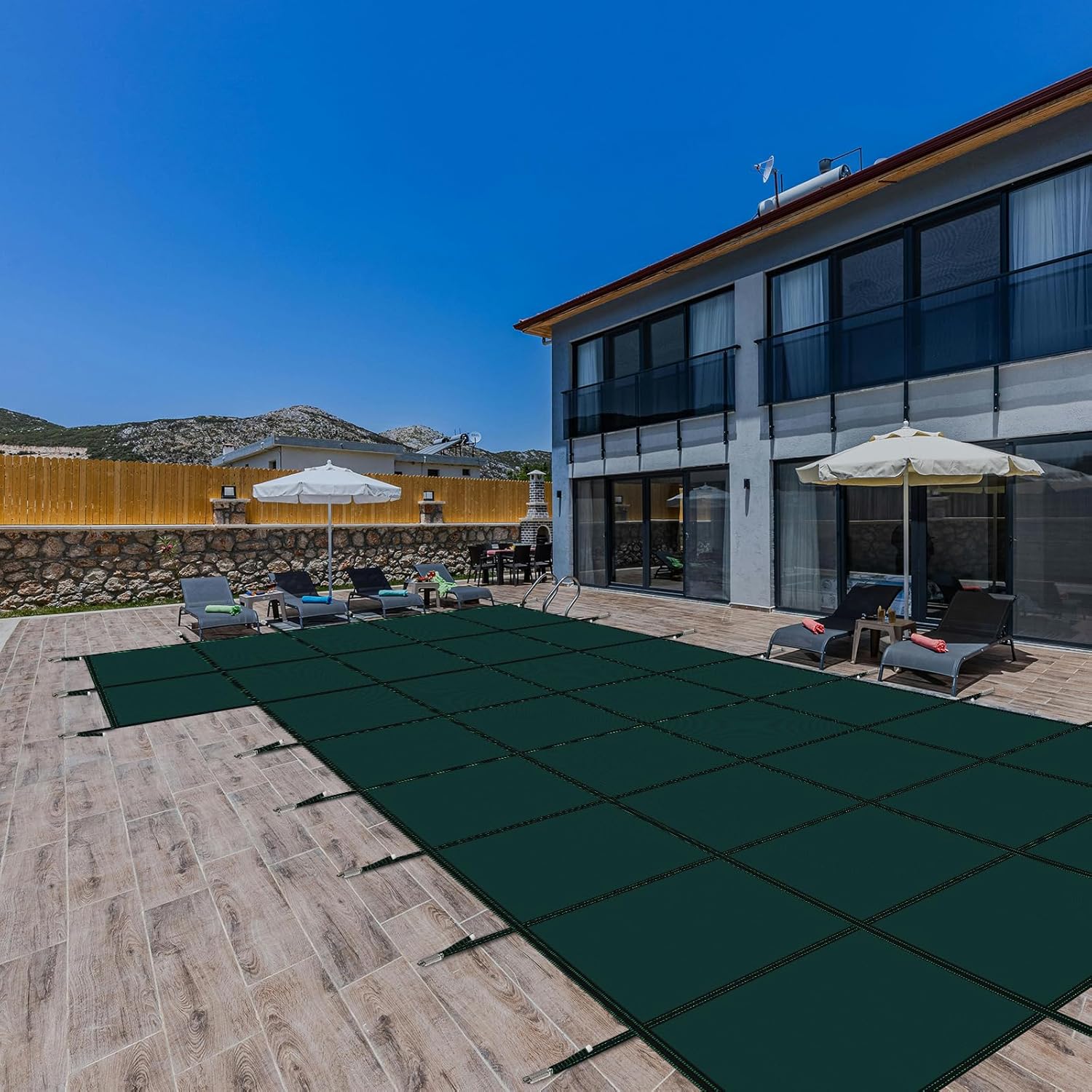 • Powerful Tight Mesh Design: Crafted with a durable, tightly woven mesh, this inground pool cover allows water to drain while effectively blocking leaves, snow, and debris. The scrim design limits sunlight penetration, helping maintain crystal-clear water and reducing algae growth, so your pool stays clean and ready for use next season.