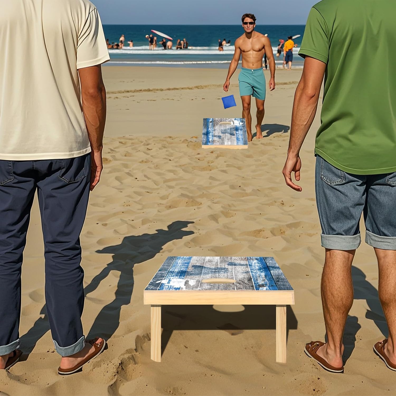 The cornhole sets are made from 100% solid wood, selected from premium pine framing. Sturdy hardwood and foldable legs form a stable structure that can even withstand the weight of an adult. Every corner has been carefully polished to reduce debri