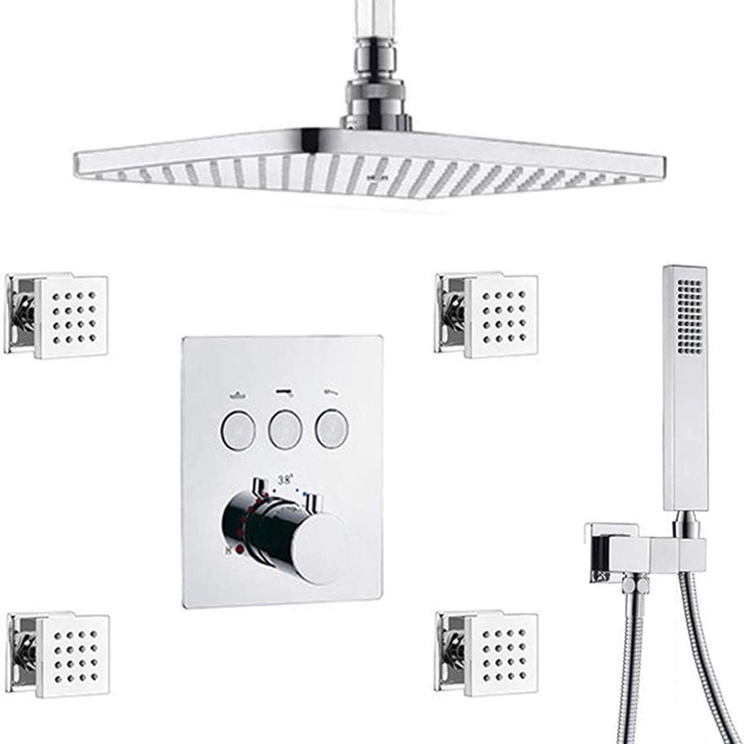 Colour: Chrome What is in the box? RAIN SHOWER HEAD 12X8 Inch Type: Fixed Rain Showerhead Material:Brass Color: Chrome Finished Feature: Big Enough to Cover Your Body Connection:G1/2" Standards CEILING SHOWER ARM 12 Inch Type: Wall Mounted Shower Arm Material:Brass Color: Chrome Finished Feature:12 Inch ceiling shower arm Connection:1/2" Standards HAND SHOWER HEAD Type:Handheld Showerhead Material: Brass Color: Chrome Finished Feature: Easy for the Elderly and Children to Shower Connection:G1/2" Standards HAND SHOWER HOLDER Type: Wall Mounted Shower Holder Bracket Material: Brass Color: Chrome Finished Feature: Adjustable Connection:1/2" Standards Shower Mixer Valve Control Features:Thermostatic design (can use together at the same time) Material: Brass & Ceramic valve Color: Chrome Finished Connection:1/2" Standards 4 PCS SHOWER BODY JET Features: Massage Material:Brass Color: Chrome Finished Connection:G1/2" Standards SHOWER HOSE 59" Type:59 Inch Stainless Steel Shower Hose Material:Stainless Steel Color: Chrome Finished Feature: Flexible and does not kink, Very easy to install. Connection:G1/2" Standards Remarks: This full set please let the professional plumbers to install it,then can let yours enjoy good bath in the bathing,thank you