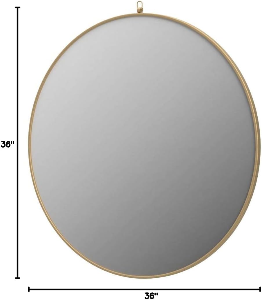 Enhance the appeal of your home or office with this contemporary mirror in brass finish featuring a thin rounded metal edges in a deep profile, reflecting a minimalist's design and trendy styling. To ensure your home safety, we use a metal hanger ring that are securely welded to the back of the metal frame, which sit on top of the frame for easy hanging. We recommend using suitable heavy duty picture/ mirror hooks, selecting the best type of fixing for the particular wall you wish to hang the mirror on, using the appropriate rawl plug if required.Features:- Material: Metal (Iron), Glass, MDF Wood- Finish: Brass- Room of Use: Living room, office, bedroom, entry way, and bathroom- Canopy included: Yes- Mirror Frame Shape: Round- Mirror Orientation: Vertical and Horizontal- Mirror Mounting/ Attachment Type: Brackets- Number of Mirror Hanging Brackets: 1- Metal rounded frame with decorative top hook- Use metal loop at the top for easy installation- Contemporary sleek design- Comes completely assembed- TSCA VI Certification- Clear beveled mirrorSpecifications:- Product Dimensions: 36"H x 36"W x 1"D- Product Weight: 22.44 lbs- Mirror Dimensions: 35.25" H x 35.25" W x 0.16" D- Warranty: 1 year limited