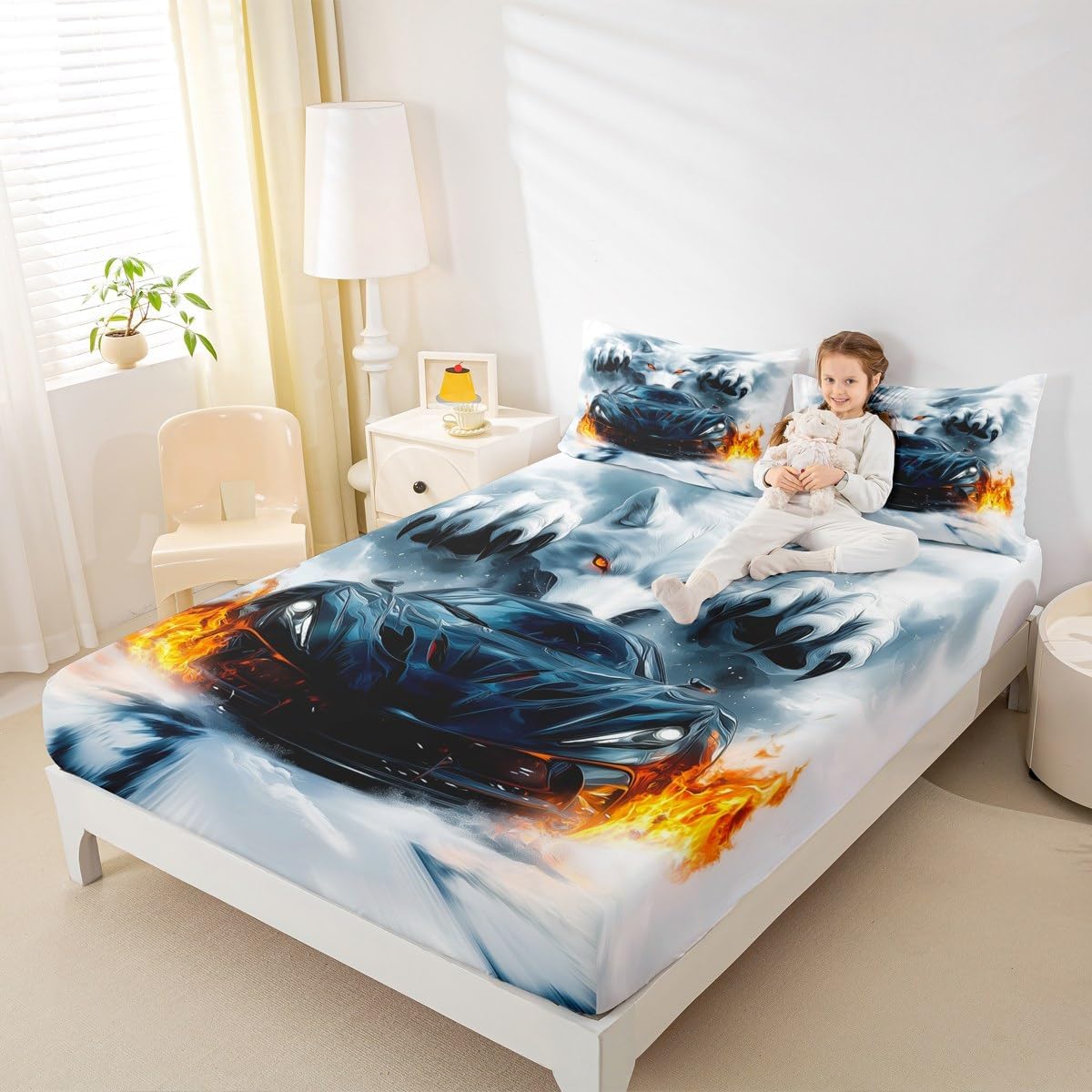 Fire Engine Fitted Sheet Full Size 3D Burning Flame Bedding Set for Kids Boys Teens Modern Rescue Vehicles Bed Sheet Set Fire Truck Bed Cover Room Decor,No Top Sheet