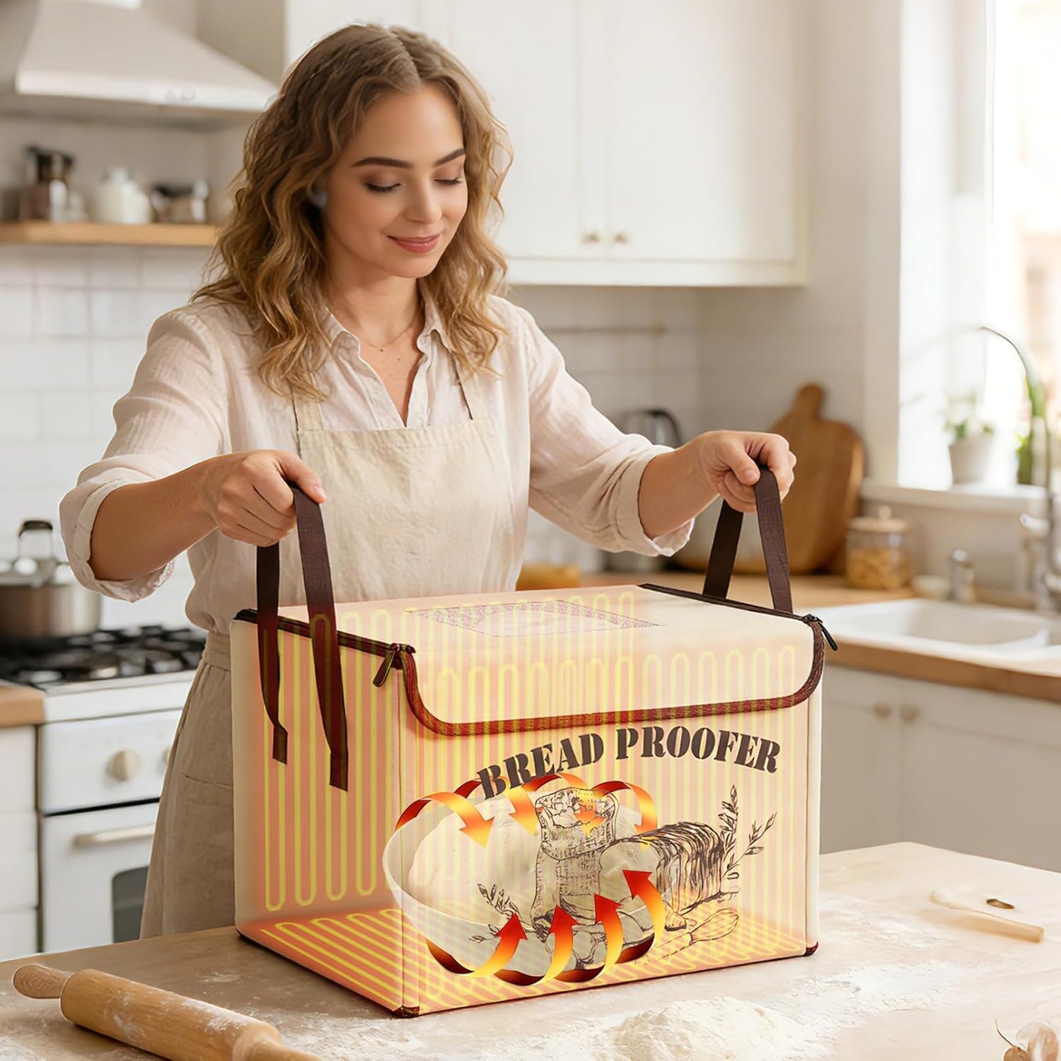 【Insulation - 5-Layer Insulation Materials for Continuous Fermentation】: Engineered with 5-layer insulation and a waterproof interior, this sourdough proofing box can lock in heat firmly, prevent bottom overheating and water loss during fermentation. No temperature swings making your baking fail. The heat preservation performs far better than the 3-layer proof box on the market 【Heating Evenly - Perfect Fermentation in All Seasons】: This bread proofing box features 3-zone heating (front, back, and bottom) and adjustable temperatures (50–113°F) for warming dough fastly and evenly. You can set the 48-hour timer when need, ensuring sufficient fermentation time for dough. Auto shutoff function can prevent overheating, keeping 100% safe no matter you are present or not. Ideal for baker, pastry chef, housewife cooking 【Space-Saving Design】:The foldable design of the proofing box makes it easy to store and saves counter space. After use, simply collapse it for convenient storage — perfect for kitchens with limited space or for those who like to bake occasionally. 【Auto Off Timer Function】The controller has auto off timer function, timer set range 0~48H, 0H is always on. LED shows the time remaining(easy to read how many hours left). At different temperature the dough proofing time is different, with the timer function the dough proofing will be much easier, no concerns of lack or over proofing. 【Specifications】The sourdough proofing warming box dimension 16X13X10 inches(perfact to fit one standard proofing bowl), 120V 45W(reach set temperature in short time), power cord length 7FT, NTC sensor cord 3.9FT, with thermostat inside for over-heating protection.