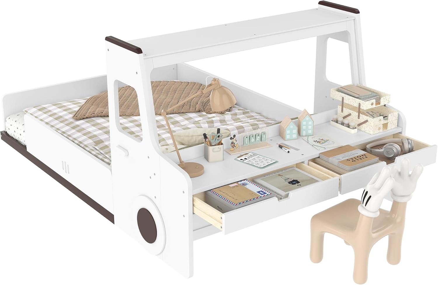 Transform your bedroom into a fun, imaginative space with this full size car-shaped floor bed. Designed with playful details like a car outline and window, this bed brings a sense of adventure to bedtime while keeping safety in mind. The low-to-floor structure allows to climb in and out easily, making it a perfect choice for younger kids learning independence. This car bed includes built-in storage drawers, offering generous space for toys, pajamas, blankets, and everyday essentials. The thoughtful desk area adds extra functionality, providing a cozy spot for drawing, reading, or quiet study moments — all without taking up extra floor space. Weight & Dimensions: Product Type: Wood Floor Bed Color: Natural/White Size: Full Material: Pine Wood+Plywood+MDF Overall Product Dimension: 88.5”L*55.52’’W*43.31”H Overall Product Weight: 106.26 LBS Recommend Mattress Thickness of Bed: 6” Weight Capacity: 450LBS for Bed, 22LBS for Drawers, 55LBS for Table Number of Package: 2 Package Dimension & Weight: Please refer to the Specification Level of Assembly: Full Assembly Needed Eligible for Hardware Packs: Yes Country of Origin: Vietnam Note: All the pictures are taken by actual samples, slight chromatic aberration may occur due to lighting or display.