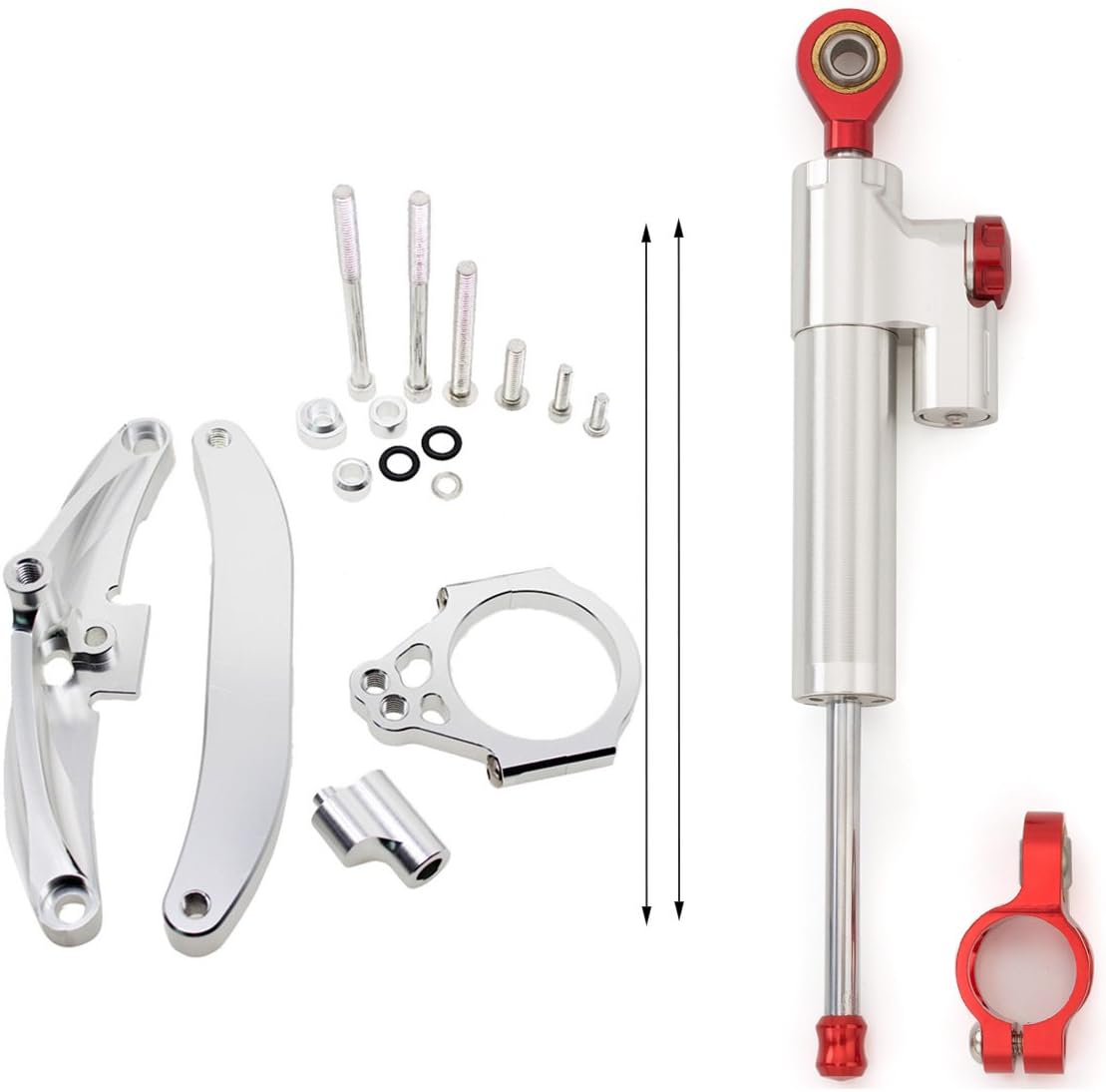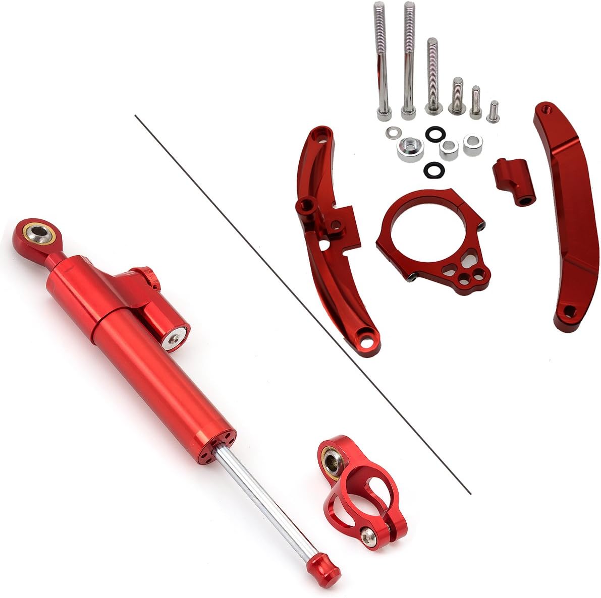 Fitment: for FZ1 FAZER 2006-2015 Feature: 100 % brand new Material:T6061-T6 Aluminum (High Quality Material, Light grade & Light-weight) Finish: CNC & Anodized (durable and not easy to fade) Color : Show as pictures If you need other colour,please leave me a note after payment, thanks! Weight: 1 LB Others: Perfect fit and no modification is needed, No installation instructions Extraordinary advantages: 1.His risk is minimal. High stability 2.The dampers are fully adjustable and can be adjusted in 22 positions so there will be a position for every rider 3.The twin-tube clamp ensures that the clamping force of the tube clamp does not obstruct the piston 4.Nitrogen pressurised heat expansion reservoir prevents the forming of air bubbles 5.Mounting kits went through countless tests through any riding conditions Package Included: 1x Adjustable Steering Damper & Stabilizer Mounting Kit Full Set Note: 1.After installation, turn the head to the very right and very left to check whether there is enough room for the activity of steering damper or not 2.Check if the steering damper and its kit reach the motorbike or oil tank his kind of risk to a bare minimum. Tank slappers and vibrations are intercepted by the damper About after-sales service: Provide three months free warranty We provide high quality products and best service to each customer Everyone, If you have any questions, please do feel free to connect with us