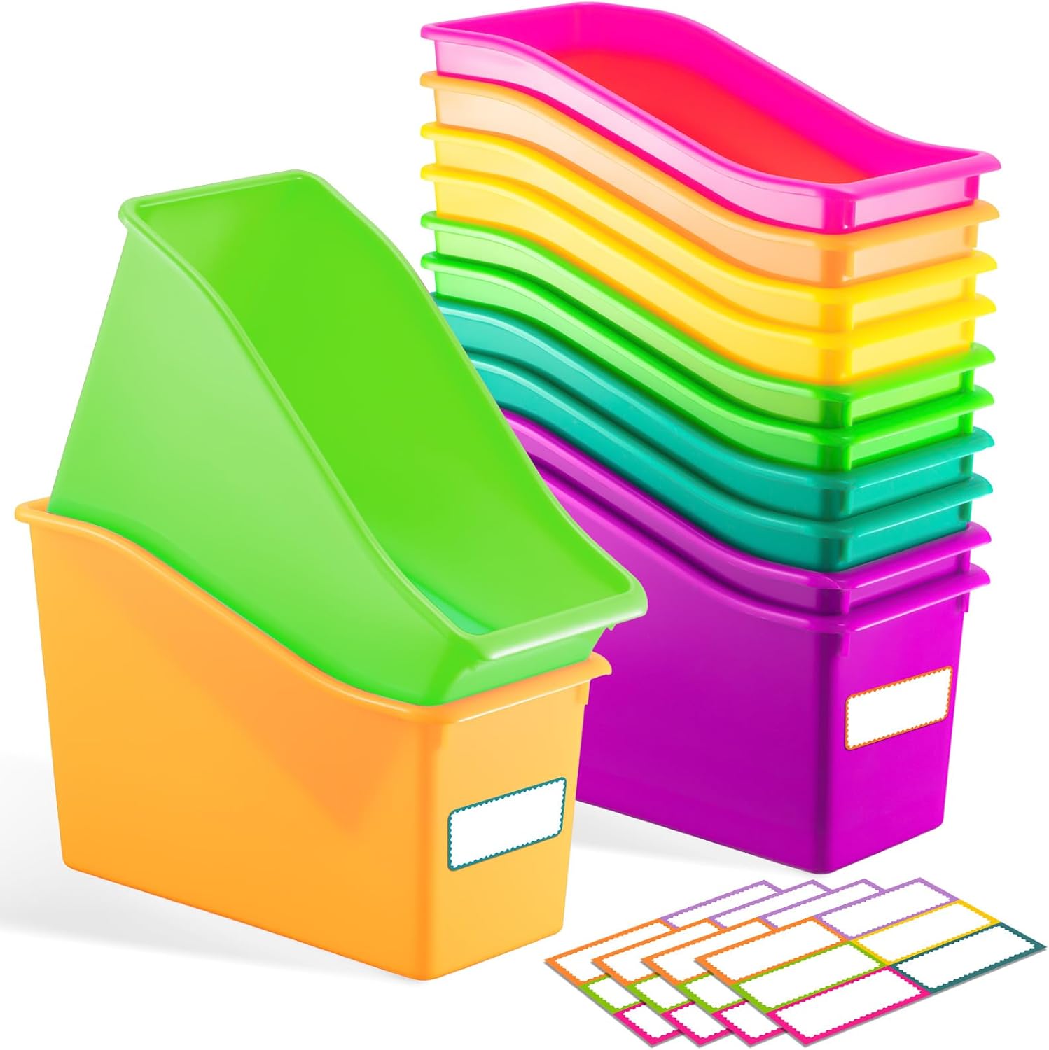 Geetery 12 Pcs Book Bin for Classroom with Labels Stackable Plastic Organizing Bins 11.5 x 5.4 x 7.5 in Book Holders Storage Bins Box Baskets for Classroom Library Home (Wildflower Color)