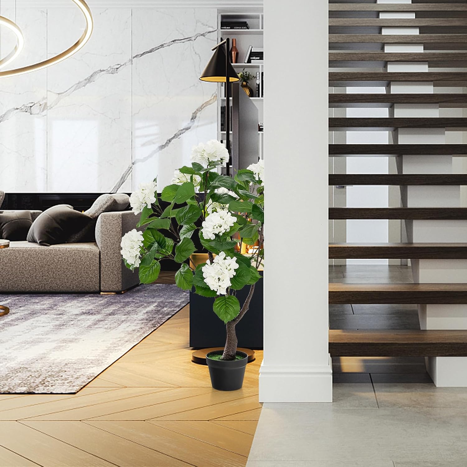 DescriptionOur artificial hydrangea tree is a stunning masterpiece that brings the beauty of nature to your space.Adorned with 11 vibrant hydrangea flowers and lush green leaves, this faux flower tree perfectly captures the essence of a real tree. Additionally, the simulated trunk and faux grass make it more exquisite. Meticulously crafted with premium silk fabric, the indoor artificial tree is odor-free and not easy to deform. Compared to real plants that may wither or die, our faux floral plant will stay alive all year round! And there is no more meticulous maintenance required. Besides, the flower pot is reinforced by cement. The added weight makes the artificial tree less prone to tip over. Moreover, its realistic appearance makes it a charming addition for front porch, living room and balcony.Feature11 lifelike silk hydrangeas make it a vivid addition in home88 verdant leaves and faux small grass bring nature to your spaceHigh quality material is allergic-proof and odor-freeCement-filled base enhances stability to prevent tipping overNo pruning, no watering and no fertilizing is needed No sunlight is required to keep the vitalityPlease slightly bend the branches for better shape If leaves falling off, they can be reinserted SpecificationColor: WhiteMaterial: Silk Fabric, PE, Cement, Foam, PPTree Height: 42.5”Size of the Flowerpot: 5.5” x 7”(Dia. x H)Number of Flowers: 11Net Weight (1 Pack): 6.5 LBSNet Weight (2 Packs): 13 LBSPackage Includes:1/2 x Artificial Hydrangea Tree