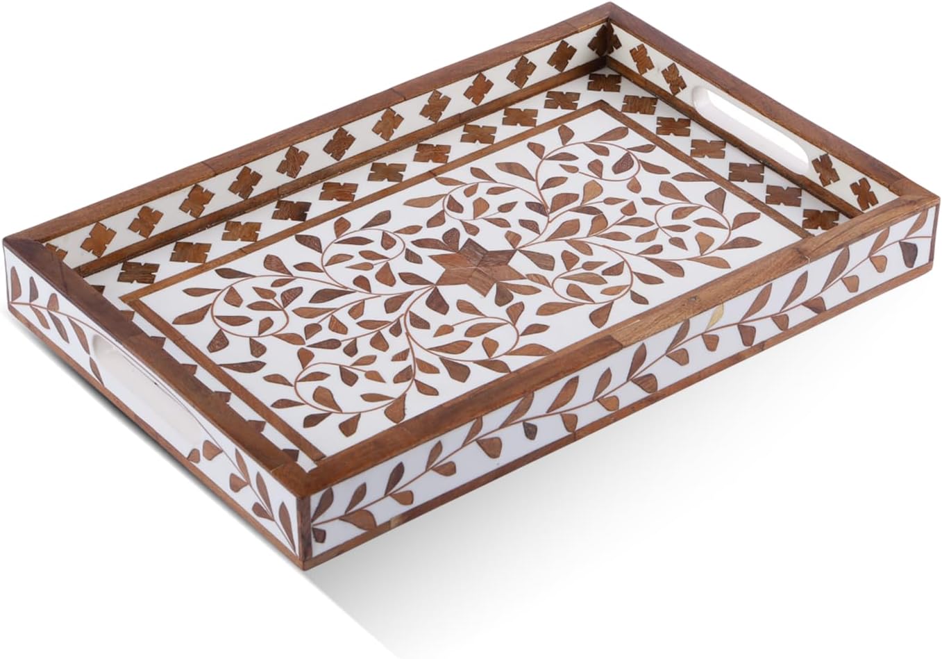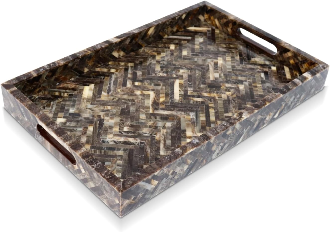 Introducing our Handcrafted Coffee Table Decor Set! More than just a set of trays, it's a testament to artisanal craftsmanship, versatility, and enduring elegance. Elevate your living space with this captivating fusion of artistry and utility. Each tray is meticulously handcrafted by skilled artisans, ensuring a unique and high-quality finish that adds character to any room.Whether you're showcasing decorative items, serving snacks and drinks, or organizing everyday essentials, this set offers unmatched style and functionality. Experience the perfect blend of art and utility with our Handcrafted Decorative Trays.Beyond its beauty, this tray is incredibly versatile. Use it as a coffee table tray to organize your essentials, as a breakfast tray for a delightful morning, or simply as a decorative piece to elevate your home decor. Its modern tray design adapts to your needs, adding functionality and elegance to any room.Looking for a gift that stands out? This luxurious tray is perfect for housewarmings, Thanksgiving, Christmas, and other special occasions. Its stylish tray design and functional appeal make it a timeless and gift-worthy choice.Crafted with durability in mind, this tray features a sturdy Pine MDF bottom and framing. It's not only durable but also ensuring top quality. Its modern tray design is built to last, making it a valuable addition to your collection.