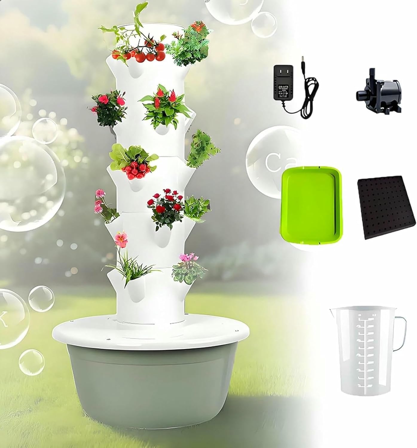 Our indoor tower garden hydroponic planting sys-tem uses aerial technology, which greatly increases the oxygen flow in the root zone and promotes the growth of planats.Utilize a hydroponic system to provide optimal nutrients and moisture to plants, resulting in faster growth and higher yields.Hydroponic Tower suitable for indoor and outdoor use, allowing you to grow fresh herbs, vegetables, and more year-round.The tower garden kit includes a water pump for automatic watering, ensuring worry-free maintenance.The hydroponic tower is perfect for gardening enthusiasts and is a thoughtful and innovative gift.【Product Specifications】Product Name: Hydroponics Growing Sys-tem TowerMaterial: ABSNumber of Layers: 5/7/9Planting Holes: 20/28/36Water Pump Power: 10/16/25WVoltage: 110V/110v/50HZProduct Size/Weight: 5 Layers: 53X105cm/7.5kg, 7 Layers: 53X134cm/8.6kg, 9 Layers: 53X163cm/9.8kgSuitable Places: Home, Office, Restaurant, Hotel, School, etc.【List of Packages】1 x Hydroponics Growing Tower1 x Controller1 x Submersible Pump1 x Seedling Tray1 x Planting Sponge1 x Measuring Cup1 x Product Manual【Tips】You can plant vegetables in sunny places, and plant some backlit flowers in places with poor lighting, or use our lighting to solve the problem of poor indoor lighting.