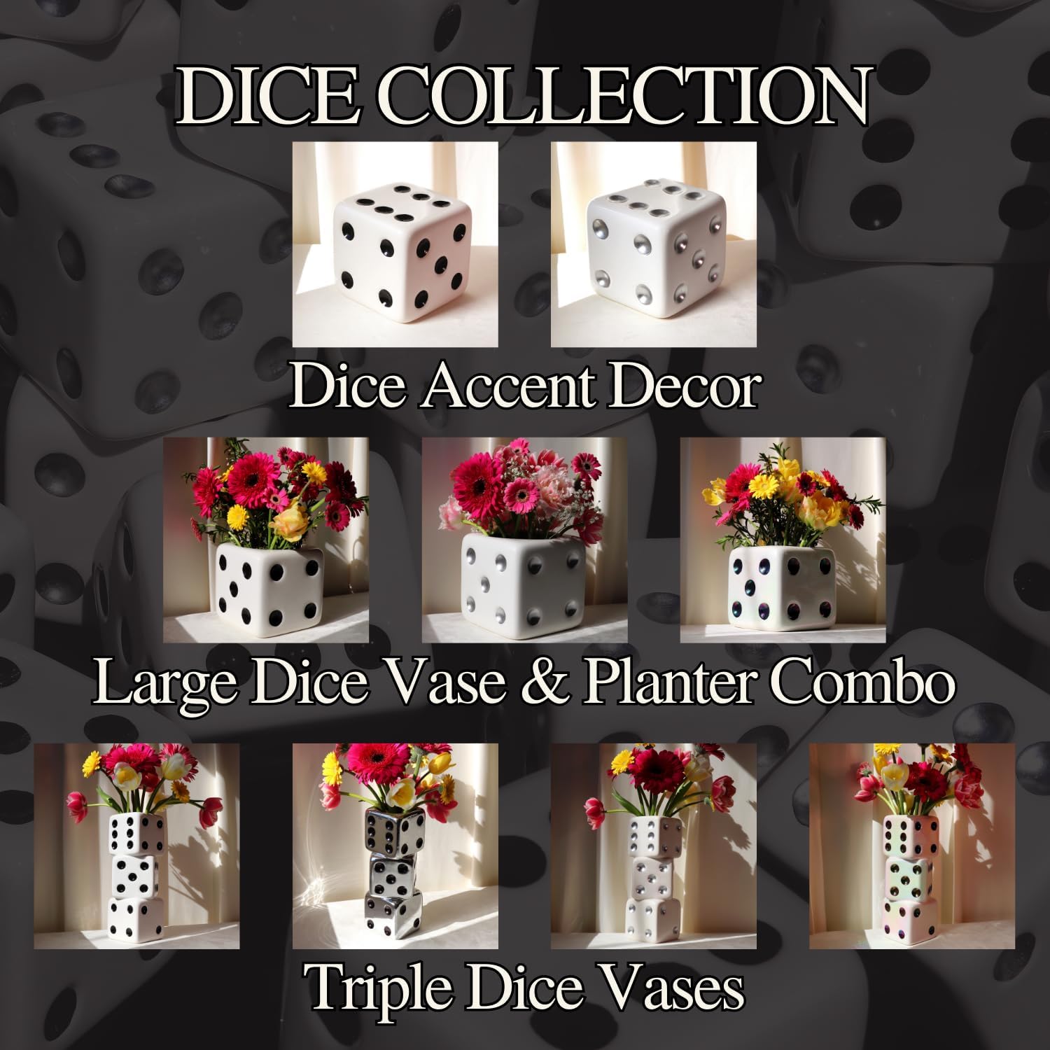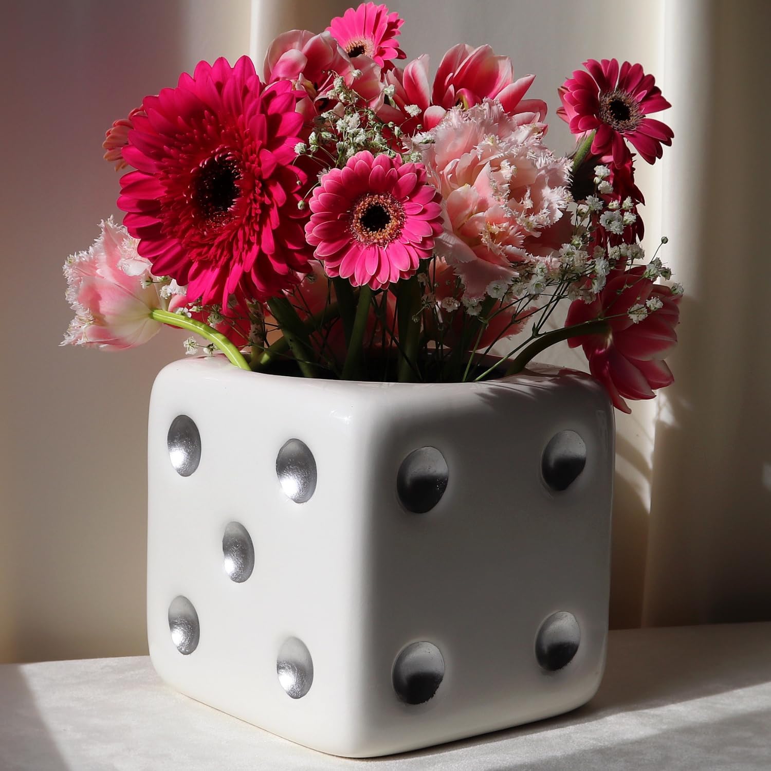 Our Reimagine Discovery Iridescent White & Black Dice Vase is a bold, eye-catching piece made for those who love decorating with personality. This oversized 6” x 6” ceramic vase turns a classic game-night staple into a glossy, statement-making accent that blends retro charm with modern edge. The 5.5” wide mouth offers plenty of room for fresh florals, dried arrangements, or even a potted plant—just note there's no drainage system, so it’s best suited for decorative use or plants in containers. Whether it’s styled on a bookshelf, bar cart, desk, or vanity, this dice vase brings a playful, artful vibe to any space. It comes packaged in a custom-designed box that’s gift-ready and just as stylish as the vase itself. Designed in the USA and crafted in partnership with expert ceramic artisans, it’s a piece that brings the unexpected to your decor—exactly the way we like it.