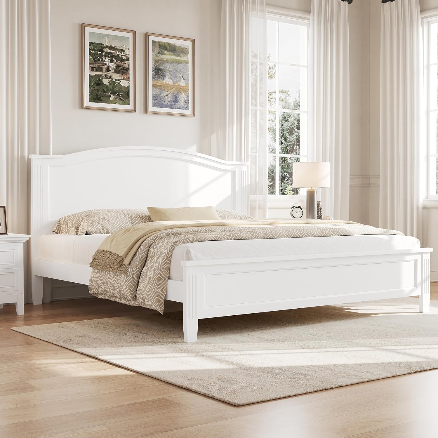 This king-size platform bed features a gracefully curved headboard and a clean straight footboard, combining simple classic design with understated elegance. Its timeless silhouette complements a wide range of interior styles—from modern to traditional—effortlessly enhancing the look of any bedroom. Crafted from high-quality solid wood and MDF, the frame is built for lasting durability. Ten closely spaced solid wood slats provide reliable, even support for latex, memory foam, or spring mattresses, eliminating the need for a box spring while helping to extend mattress life. The elevated design offers convenient under-bed storage for bins or everyday items and allows robot vacuums to pass through freely for easy, hassle-free cleaning. Thoughtfully balanced in both form and function, this bed brings lasting comfort, style, and practicality to your daily life. Description Material: Solid Wood+MDF Size :King Color: Espresso/White/Black Numbers of Package: 1 Spring Box: No need Assembly Required: Yes Origin: Vietnam Overall Product Dimension: 83.5''L x 79.3''W x 45.5''H Bed Dimension: 80.6''x 76.4'' Total Height: 45.5’' Recommend Mattress Thickness of Bed: 8-10'' Overall Product Weight: 94lbs Bed Weight Capacity: 600lbs