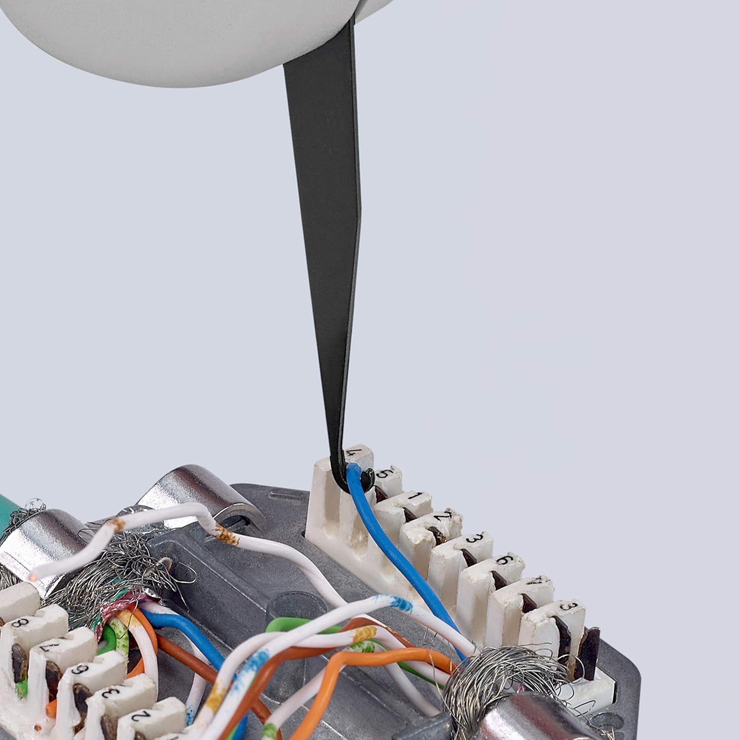 Tool for putting on boards, sockets and fields. For UTP and STP cables, conductor ø 0.4 - 0.8 mm. With integrated pulling hook and release blade.
