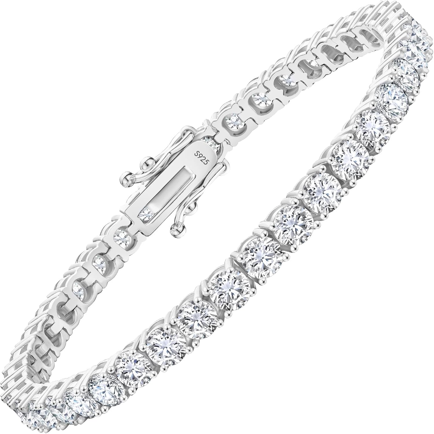 Q: Is the clasp secure? A: The KRKC&CO Moissanite Tennis Bracelet features a double-sided safety clasp and is hand-tested for clasp strength.Q: Will it tarnish? A: Our Moissanite Tennis Bracelet features 14K gold plating over 925 sterling silver with a 5-layer plating system designed to resist tarnish and maintain lasting luster.Q: Care tips?A: Storage – Proper storage in a dry place helps prevent tarnish buildup. Cleaning – Regular gentle cleaning with a soft cloth can keep it looking brightQ: How to Measure and choose the siz?A: Use a soft measuring tape or string around your wrist bone (where you'd wear the bracelet)Add 0.5" to 1" to your wrist measurement for comfortable fit6.5" – Best for wrists measuring 5.5"–6"7.0" – Best for wrists measuring 6"–6.5" (most common size)7.5" – Best for wrists measuring 6.5"–7"Fit Tips:Tennis bracelets should fit snugly but move freely around your wrist. You should be able to fit one finger between the bracelet and your wrist.*lf this isn't enough to help you decide, please contact us to get our bracelet size guide.Q: Is it comfortable to wear daily?A: This Moissanite Tennis Bracelet is generally comfortable for daily wearLightweight – it's comfortable for all-day wear;Smooth, flat links – Prevent snagging and twisting, making it easy to move naturally;Hypoallergenic 925 sterling silver – Safe for sensitive skin with no irritation reported.Q: How does it compare to real diamonds? A: Moissanite offers greater brilliance and fire at about 1/10th the cost of a diamond, with high durability (9.25 Mohs), making it a popular lab-grown alternative.Tennis Bracelet Jewelry Usage and Care GuideHow to Close1. Insert the tab into the notch.2. Press both clasps to lock the tabs.How to Open1. Open both clasps.2. Press and hold the clicking mechanisms to pull the bracelet.How to Fix ItThe clasp on bracelet is a mechanical design. If it feels slightly loose after use, this is typical of the authentic S925 silver due to its high purity and softness.Follow our steps to make your bracelet clasp more secure!1. Use needle-nose pliers to gently adjust the clicking mechanisms to widen the V-shaped opening.2. Use a tool to squeeze the clasp, reducing the size of the hole.
