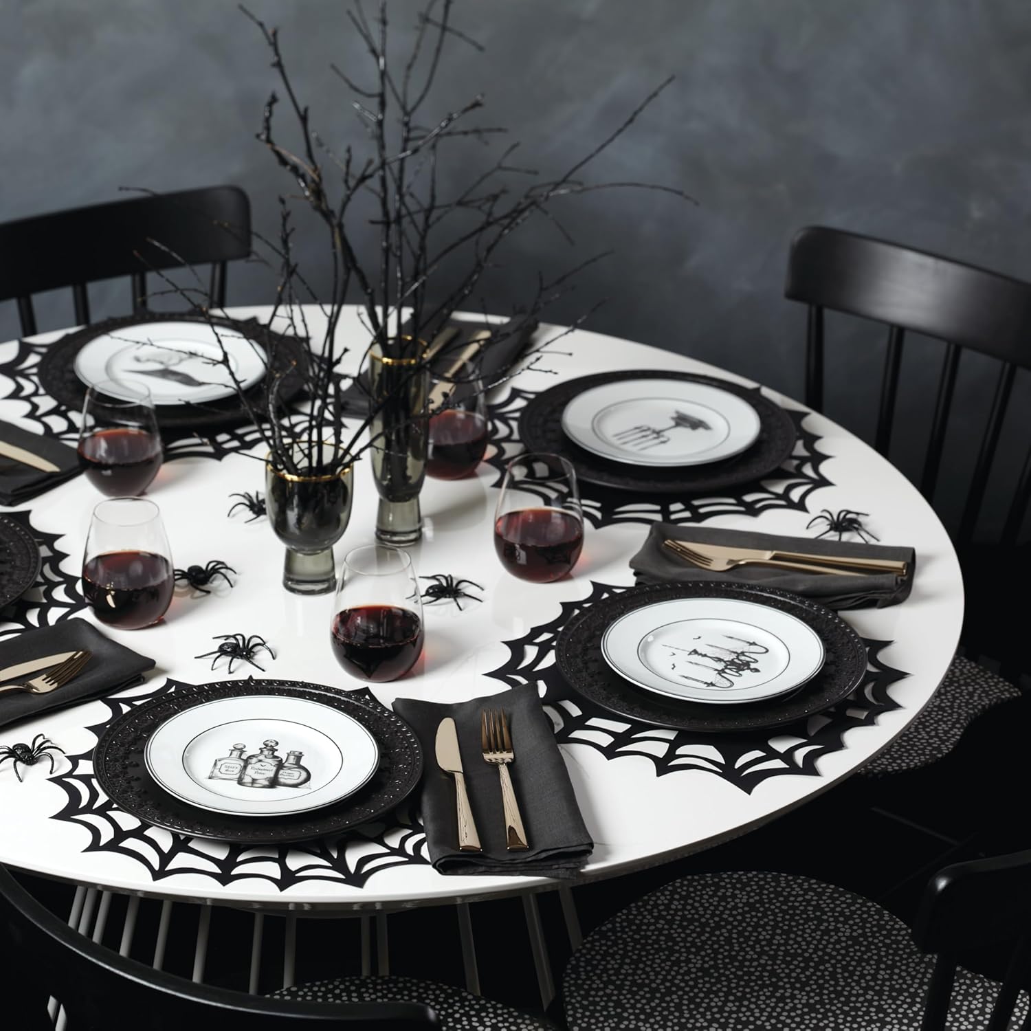 A wickedly enchanting assortment, our Vintage Halloween collection brings a bit of voodoo mystery to your home. This 4-piece dessert plate set is crafted of ivory porcelain and features hand-drawn artwork of a chandelier, a raven, potions and a candelabra. It's perfect for serving treats this Halloween season]