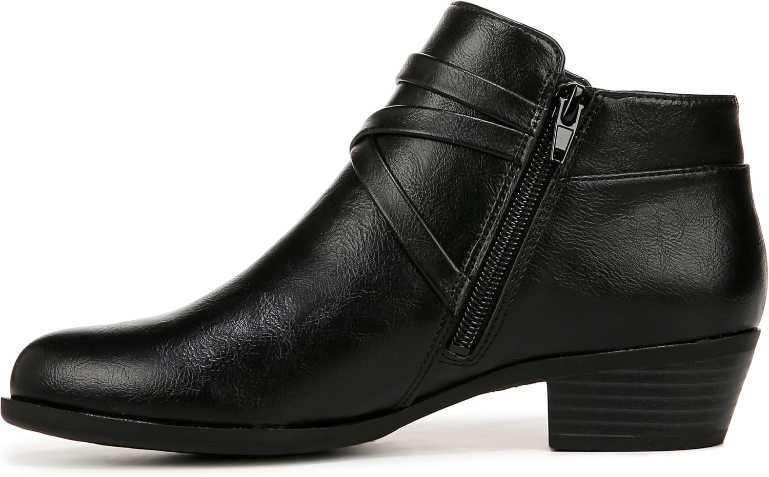 Western meets tailored in these women's ankle booties with standout comfort and styling. Faux leather upper with a round toe, side zip, and decorative strap and grommet detail. Linings crafted from partially recycled materials. Soft System® comfort package provides all-day support, flex, and cushioning. Get next-level comfort with Velocity 2.0®, featuring luxe linings, superior cushioning, and a premium insole with shock absorption & pressure distribution. Traction sole for extra stability. Just Right Height 1 3/8 inch heel.