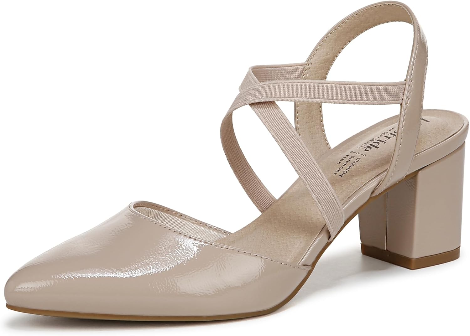 Discover the perfect fit in these timeless and comfortable women’s slingback heels with stretch straps. Faux leather or microfiber upper with a softly pointed toe, slip-on fit with stretch elastic straps, and slingback strap. Linings crafted from partially recycled materials. Soft System® comfort package provides all-day support, flex, and cushioning. Traction sole for extra stability. Just Right Height 2 3/8 inch block heel.