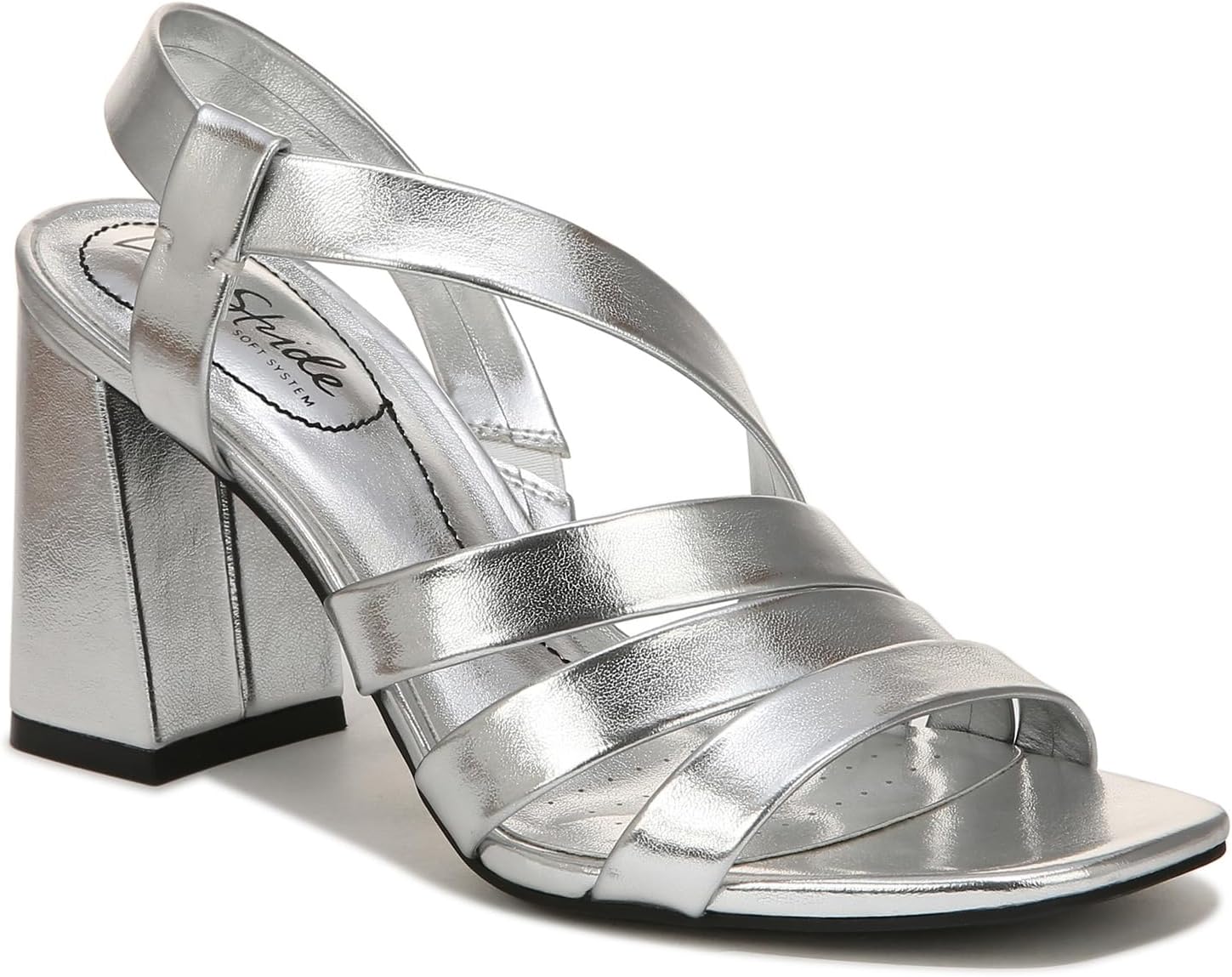 Dance all night. Celebrate every moment in comfort with block heel strappy sandals for women. Faux leather upper with a stretch gore strap, open square toe, slip-on fit with heel strap, and all-over matching color design. Heel counter and insole board partially crafted with recycled materials. Soft System® comfort package provides all-day support, flex, and cushioning. Traction sole provides you with extra stability. Just Right Height 3.25 inch flared block heel.