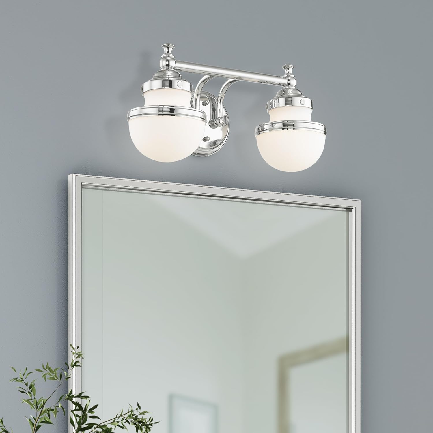 Sleek and simple lines define this beautiful polished chrome bath fixture. The clean, bold look of modernity blends with a raw industrial inspiration and hand blown white opal glass give this design a versatile and eclectic look that works with nearly any style of home decor.