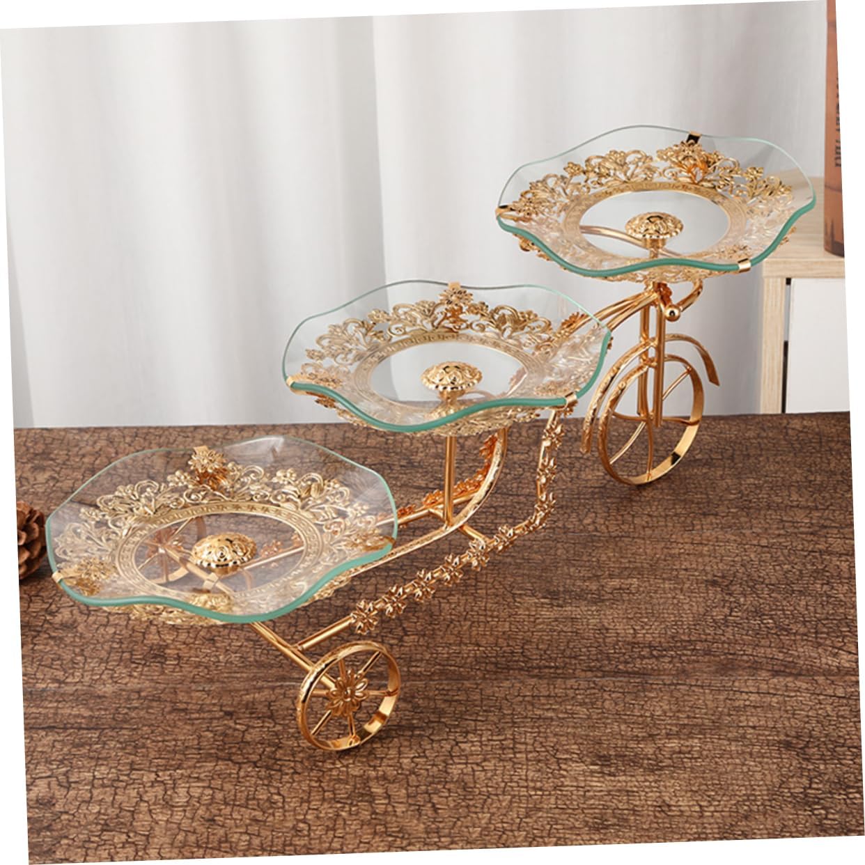Package Include 1 x glass tray Features -Material:glass + iron Housewarming present -Color:Golden Dessert Storage Stand -Size:41.00X20.50X18.00cm/16.11X8.06X7.07in Three-layer Plate -Strong bearing capacity, strong and not easy to shake Party Supply. -Stylish design blends in seamlessly with the contemporary household Snack Dish. - for storage of fruit, snacks and other household items Fruit Container. -Making your kitchen and home look beautiful and tidy Fruit Plate with Rack. -Made of , can be reused over again Fruit Stand.Goods InformationThree-layer Fruit Tray The creative three-layer fruit stand is made of , versatile, suitable for display of cupcakes, desserts, cookies, fruits, sweets, chocolates, pastries and snacks.Dessert Plate Rack for any party, formal banquet or daily life