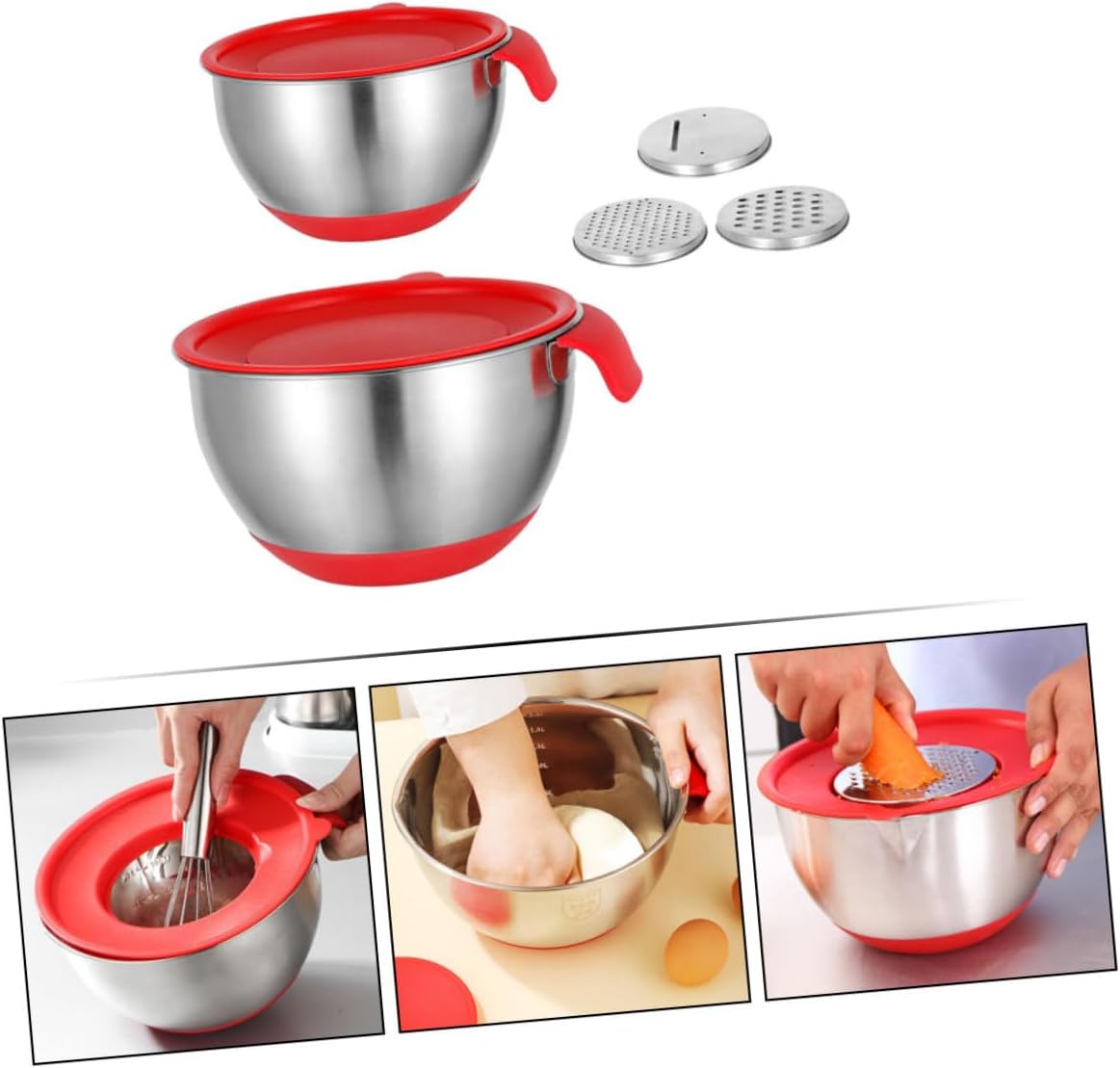 Package List 1 x mixing bowl(18cm) 1 x mixing bowl(20cm) 2 x covers 3 x graters Characteristics -Product Info:Stainless steel egg beating basin -Size:20.00X20.00X12.00cm/7.86X7.86X4.72in -Size:18.00X18.00X10.50cm/7.07X7.07X4.13in -Color:Assorted Color -Material:Stainless steel, silicone - The non-slip silicone bottom design helps you save storage space, and you don't have to worry about the bowl shaking when mixing baking mixing bowls. - Reasonable design, appearance smooth and practical design. to family and friends food bowl. - The bowl is made of stainless steel material, fine workmanship the practicality and durability. - The Mixing bowl can be stacked, saving cabinet space, lightweight and portable, suitable for indoor or outdoor use batter bowl. - You can store your all kinds of food, such as salad, noodle, fruit, rice, dessert, etc metal prep bowls.Goods Informationdeep mixing bowls Great for any types of foods such as dried fruit, salad, snack and much more.batter bowl The multi-function Salad Bowl can also be used as a fruit bowl.mixing bowls with handles The bowl is made of silicone, stainless steel material for safe and use.mixing bowl with handle Fine workmanship the practicality and durability.food mixing bowl You will enjoy the easy and happy food time