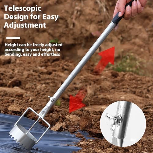 Introducing our upgraded multifunctional mulch puncher, the perfect tool for gardeners and landscapers seeking efficiency and precision. This innovative device simplifies the process of punching holes in plastic mulch, weed control fabric, and greenhouse film, making it an essential addition to your gardening toolkit. Crafted from durable stainless steel, the serrated blade effortlessly slices through various materials, ensuring clean and accurate holes. The adjustable telescopic handle, made from sturdy galvanized pipe, allows for comfortable use without the need to bend over, reducing strain on your back during long gardening sessions. The rubber non-slip grip ensures maximum control and comfort, enabling you to work with ease. Whether you're planting vegetables, fruits, or flowers, our mulch puncher enhances your gardening experience by promoting efficient water drainage and weed control. This tool is ideal for both novice gardeners and seasoned horticulturists who appreciate quality and functionality. With our mulch puncher, you can also recycle waste mulch effectively, contributing to a sustainable gardening practice while maintaining a tidy gardening environment. Investing in this versatile tool means investing in the health of your garden. Make the smart choice for your gardening needs and enjoy the benefits of a well-maintained outdoor space. Package includes: 1 Mulch Puncher and 1 Installation Accessory Package. Elevate your gardening efficiency today!