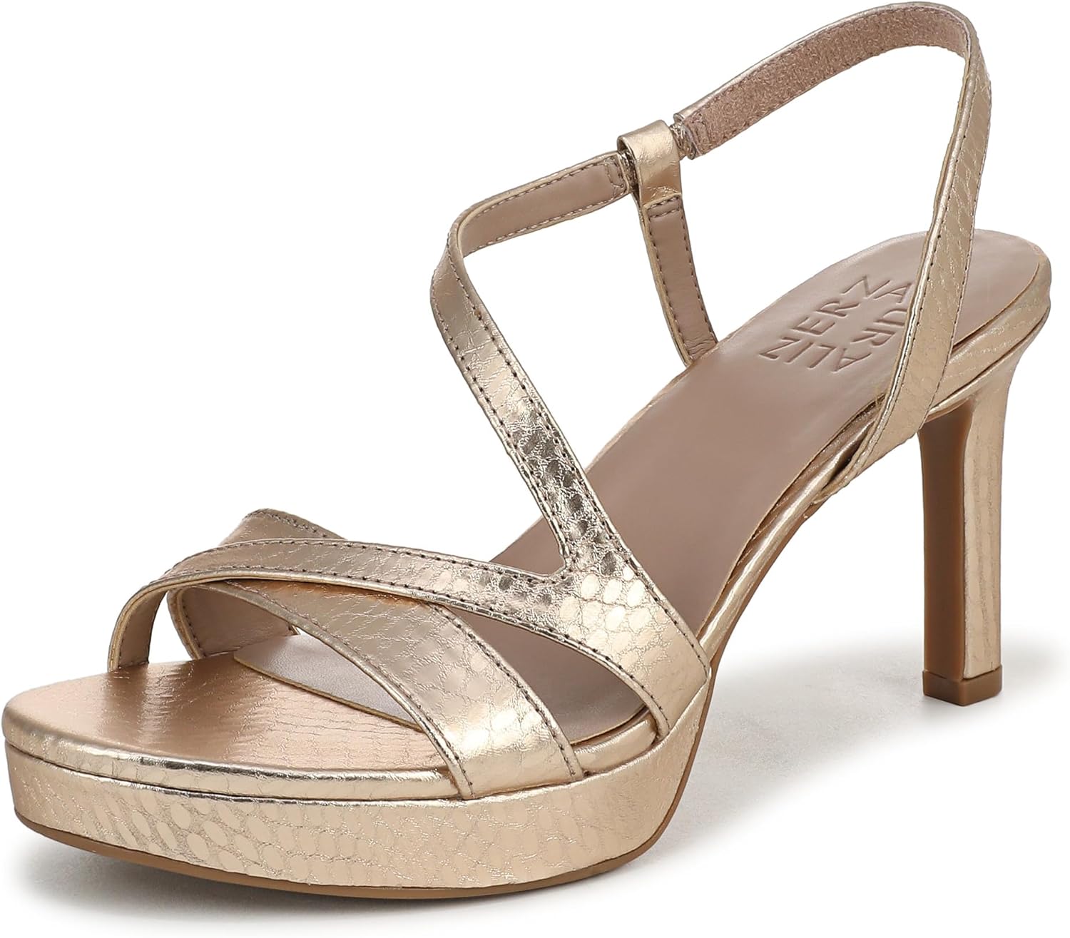 Invite-worthy high heels. With an easy slingback strap, slip these dressy comfort sandals on and make an unforgettable entrance to your next event. Statement-making platform shoes with strappy design. Synthetic or metallic synthetic upper with an open toe. Contour+ Comfort technology for a premium fit and all-day comfort experience. 3/4 inch platform, 3 3/8 inch heel. Consciously packaged: 100% of our shoe boxes are made of 80% recycled paper + soy-based ink. Designed using some environmentally preferred materials. WHY YOU’LL LOVE IT: Forever elegant silhouettes with all day wearability, available in an inclusive range of sizes and widths. Designed to the contours of a woman’s foot. The Beautiful Fit. Since 1927. Naturalizer was one of the first shoe brands that women could turn to for the feminine style they coveted and the comfort they thought was impossible to attain. Naturalizer's fresh, unpretentious designs are a smooth fit with your wardrobe, your life and your own unique style. Naturalizer promises style that makes you look good and feel good - always.