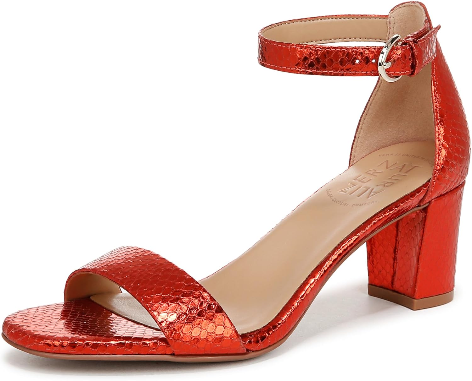 From our Modern Icons and True Colors collections // Available in inclusive colors and anchored by a comfortable ankle strap, these womens sandals are a striking-yet-simple silhouette. With Vera, you have options; shop narrow, medium and wide width heels for women. Minimal womens dress shoes with slender ankle strap and all-day comfort. Fabric, leather, patent leather, metallic leather or suede upper with an open almond toe. Adjustable buckle closure. Contour+ Comfort technology for a premium fit and all-day comfort experience. Non-slip outsole. 2 3/8 inch comfortable chunky block heel. Consciously packaged: 100% of our shoe boxes are made of 80% recycled paper + soy-based ink. Designed using sustainable materials. WHY YOU'LL LOVE IT: Designed to the contours of a woman's foot. Available in an inclusive range of sizes and widths for a custom-designed fit and all-day wear, with a promise of both elegance and utility. The Beautiful Fit. Since 1927.