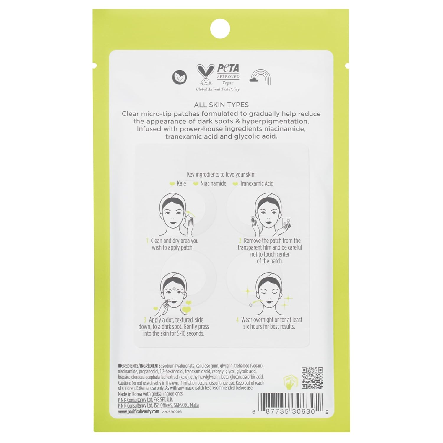 Erase Dark Spots with Pacifica Kale Dissolve Dark Spot Micropatches – Small Patches, Big Results! These innovative micropatches are a game-changer for anyone dealing with stubborn dark spots, melasma patches, or post-acne marks. Unlike creams that sit on the surface, each clear patch uses tiny self-dissolving “micro-darts” to deliver potent brightening ingredients *beneath* the skin’s surface. It’s like a mini microneedling session focused on your dark spot – but completely painless and easy to do at home. Simply apply a patch directly over the spot you want to fade and let it work its magic.How It Works: Each patch is covered in an array of microscopic cones made from active ingredients. When you press the patch onto your skin, you’ll feel a mild prickly sensation for just a moment – that’s how you know the micro-tips are making contact. These tips then dissolve over the next few hours, releasing the ingredients deep into the stratum corneum (top layer of skin) where they can start breaking up pigment accumulations}. The patch material keeps the area occluded (protected), which enhances absorption and prevents the actives from evaporating or rubbing off. After about 6-8 hours (overnight is perfect), the microneedles have disappeared and you can peel the patch off. No residue, no mess – just potent brighteners having penetrated exactly where you need them.Clinically Proven Ingredients for Spots: We loaded these patches with a dermatologist-approved cocktail for fading discoloration. Niacinamide is a star multi-tasker that brightens and also calms any redness around the spot, making it great for acne scars. Tranexamic Acid is an emerging powerhouse for hyperpigmentation – it works by interrupting the pathways in skin that lead to excess melanin (pigment) production, effectively “turning down” dark spots over time. Glycolic Acid gently exfoliates the surface of the dark spot, encouraging the discolored cells to shed faster and revealing new, even-toned skin beneath. We even added a touch of vitamin C (ascorbic acid derivative) and kale extract for an antioxidant boost. This combination is comparable to what you’d find in professional spot treatments, but delivered in a focused, safe-at-home manner.Great for Post-Acne Marks & Sun Spots: These patches are ideal for that pesky pimple scar that stays pink or brown on your cheek, or the little sun spots on your nose and cheeks from last summer. Because they’re semi-transparent and very thin, you can even wear them during the day if you want (they’ll be nearly invisible on your skin). They won’t budge until you take them off. Many people like to apply at night – for example, Sunday and Wednesday nights – as part of their routine. Over 2-4 weeks (with consistent use), you’ll notice the spot’s edges fading and the color lifting. For larger areas of melasma or clusters of spots, you can use multiple patches at once to cover each trouble area..Safe, Gentle & Clean: Traditional spot-fading ingredients like hydroquinone can be irritating or off-limits for many – that’s why we chose safer alternatives. Our Kale Dissolve patches are free from hydroquinone and rely on gentler yet effective agents. They are also free of any artificial fragrance or dyes; the formula is as clean as it gets. We’ve tested these patches on all skin tones and types, and they do not leave any scarring or indentations (the microtips are too small to cause any injury). Of course, always apply to clean skin and avoid placing them on any open blemishes or cuts – these are meant for healed spots that left pigment, not active acne. With Pacifica’s Dark Spot Micropatches, you can finally take control of stubborn spots in a precise, targeted way. It’s easy, fun (there’s something high-tech and cool about using them!), and most importantly – it works.