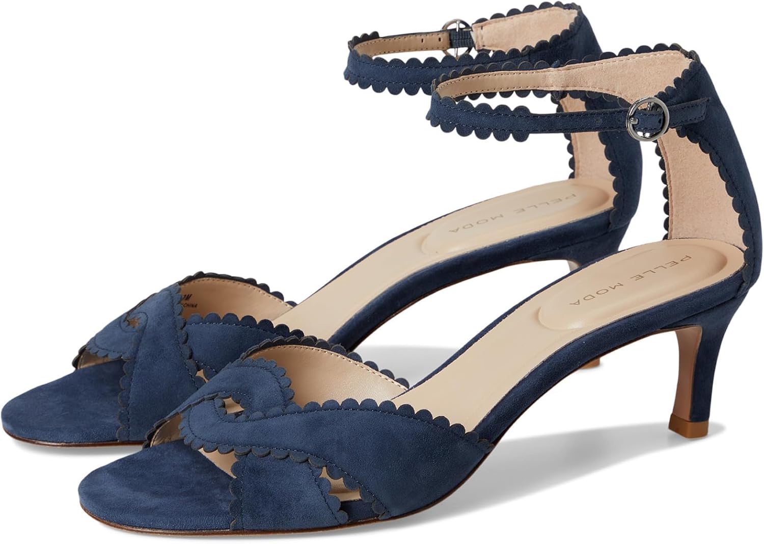 Two piece pump with open toe, criss cross upper straps with soft scallop details, ankle strap has an adjustible buckle