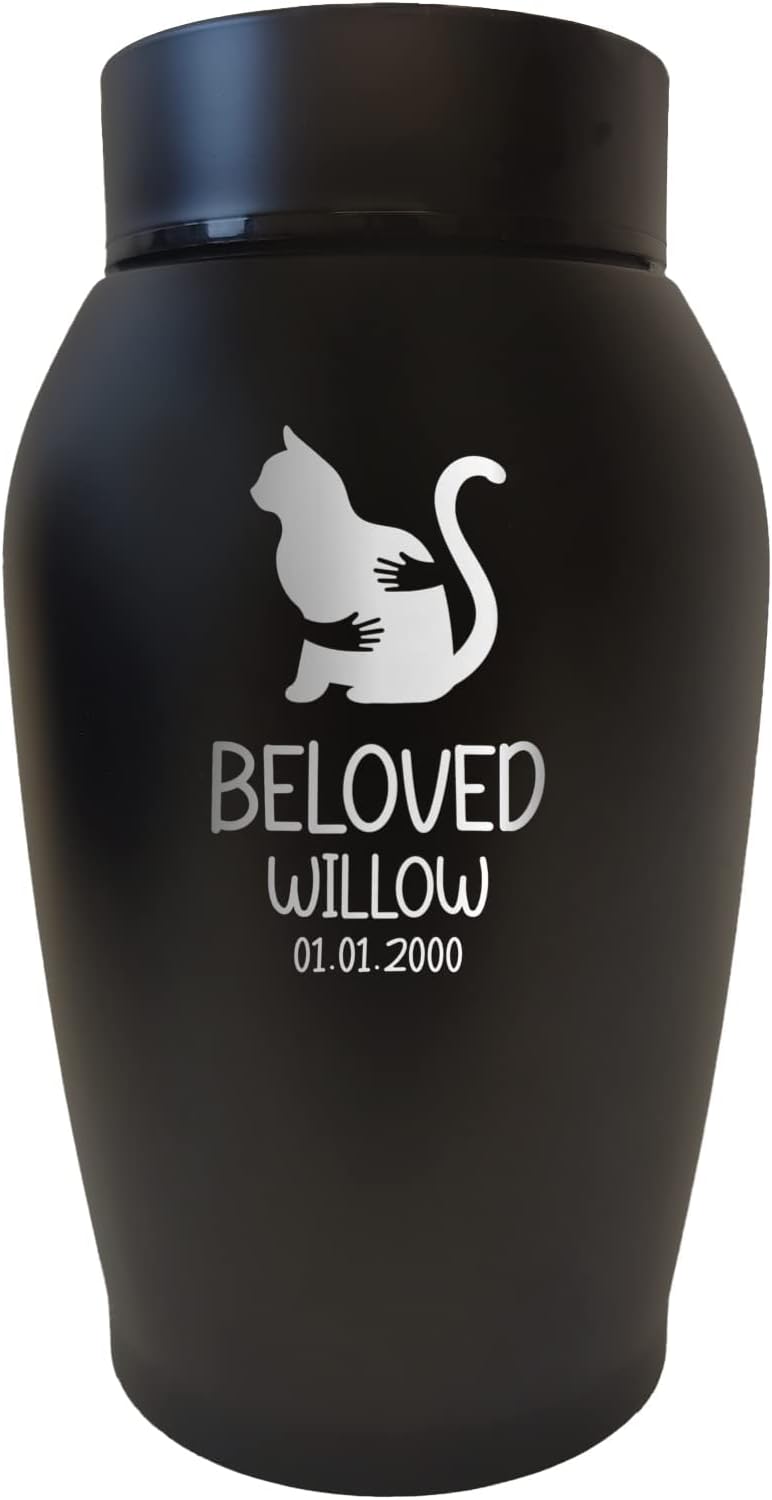 Our Personalized Custom cat Keepsake Urn is a heartfelt tribute to your beloved feline companion. Crafted with care and precision, this small black powder coated steel urn measures 3" x 3" x 5.2" and is designed to hold the ashes of cats weighing between 12 to 16 pounds. It offers a dignified final resting place and can be engraved with your cat's name and date, creating a personalized keepsake that beautifully honors their unique spirit. The stainless steel construction ensures durability, and the airtight closure provides a secure environment for your pet's ashes. This elegant urn serves as a compassionate reminder of the love and joy your cat brought into your life, offering comfort and a lasting symbol of their impact.