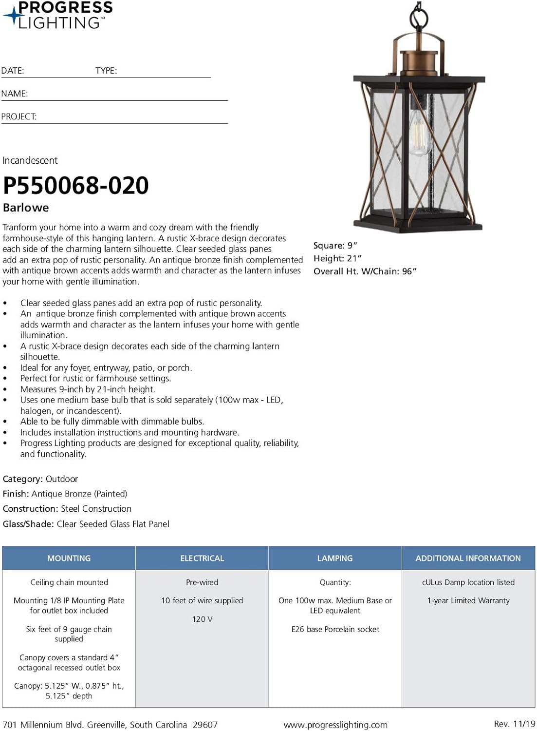Transform your home into a warm and cozy dream with the friendly farmhouse-style of this hanging lantern. A rustic X-brace design decorates each side of the charming lantern silhouette. Clear seeded glass panes add an extra pop of rustic personality. An antique bronze finish complemented with antique copper accents adds warmth and character as the lantern infuses your home with gentle illumination.