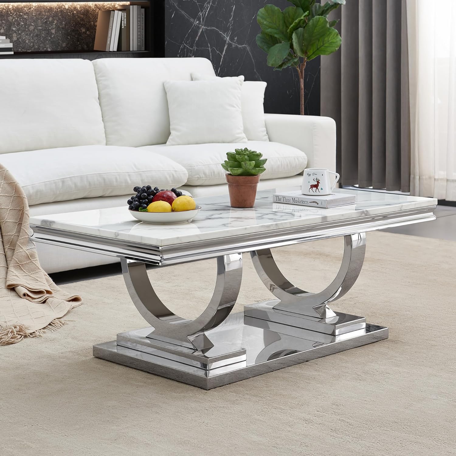 Luxury Faux Marble Top This rectangular coffee table is made of high-quality MDF board with smooth marble texture which makes the table top resistant to liquids, food stains, oil, heat, scratches, and easy to clean. Let your family and friends can share precious moments together and feel the beauty of life. Heavy-duty Steel Frame The concrete coffee table features a thickened faux marble top and a high-quality stainless steel legs, providing firm construction and reliable durability to withstand years of daily use in your home. Modern and Stylish Design The minimalist lines, elegant tones and silver mirrored stainless steel frame which adds a charming and beautiful look to your space, suitable for a variety of decor styles, like modern, mid century, farmhouse, rustic, retro, industrial decor and more. Rectangle Coffee Table The 47-inch table top is spacious enough to hold your favourite decorations and makes room more pleasant and comfortable. You can place this metal coffee table in front of the sofa which will provides you a perfect space to fully relax and relieve fatigue after a busy day. Specification Table Top Material: Stainless Steel, Engineered Wood, Faux Marble Frame Material: Stainless Steel Simple Assembly Required: Yes Package Included: 1 x Coffee Table
