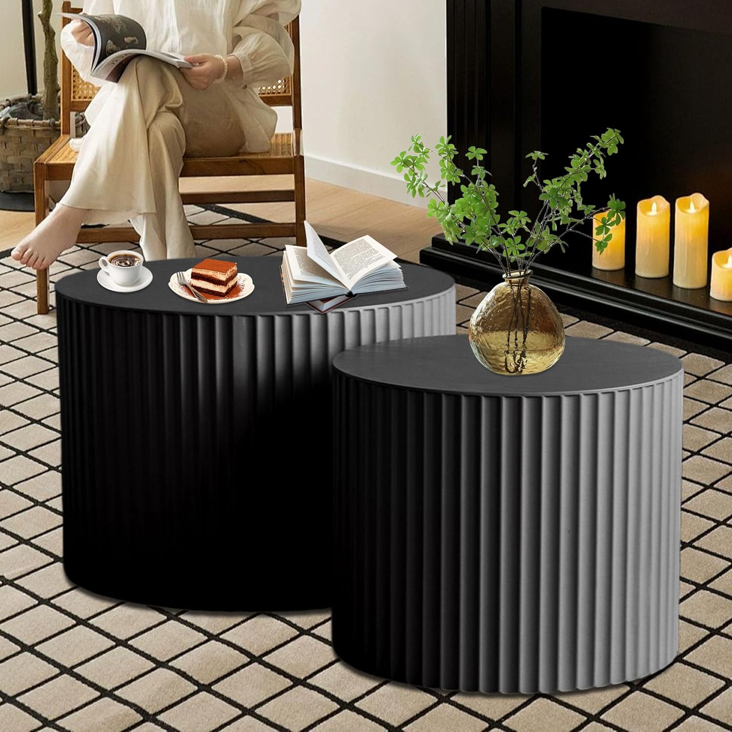 • [Coffee Table Set of 2]- Modern drum coffee table set, two sizes, small size includes a large coffee table (18.9''*18.9''*H14.96'') and a small side table (14.96''*14.96''*H12.6''); large size includes a large coffee table (27.56''*27.56''*H15.75'') and a small side table (19.69''*19.69''*H13.78'')