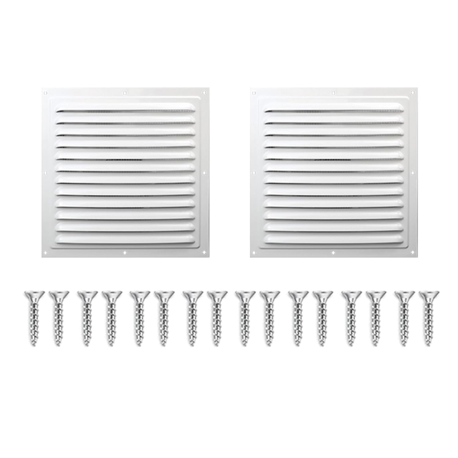 Feature:Aluminum AlloyOur louvered vents are made of aluminum alloy, which has good anti-corrosion and anti-rust characteristics, high compressive strength, stable structure and not easy to deform, which can maintain stable performance even in the face of high temperature and humid environmentWaterproof Unique slanting shutter structure of this aluminum wall vent, skillfully blocks the intrusion of rainwater, to ensure that the indoor dry and comfortable. The metal shed vent with built-in screen mesh forms a solid barrier, effectively preventing birds and small rodents from infesting your home, guarding your peace of mindVentilationThis white square louvered vent can be easily adapted to a variety of ventilation scenarios in your home. Whether it is a wall, garage, shed or eaves, it can play its good ventilation performance, promote air circulation, and create a fresh and healthy living environment for youMulti-purposeThe square vent louver vent grille is not only limited to the ventilation function, it can also effectively dissipate heat, rain and peep, which is ideal for basement door and window ventilation, mechanical equipment cooling and indoor privacy protection to meet diversified needsMulti-sizeWe provide four different sizes of white aluminum gable vents for you to choose according to your needs, and thoughtfully equipped with sufficient screws to simplify the installation process. With the clear design of the screw holes, the installation can be completed quickly and efficiently without specialized skills or complicated toolsSpecification:Name: Aluminum Wall VentMaterial: Aluminum AlloyColor: WhiteSize: 150*150mm / 5.91*5.91in, 200*200mm / 7.87*7.87in, 250*250mm / 9.84*9.84in, 300*300mm / 11.81*11.81in(Optional)Package Included:2 * Aluminum Wall Vents16 * Screws