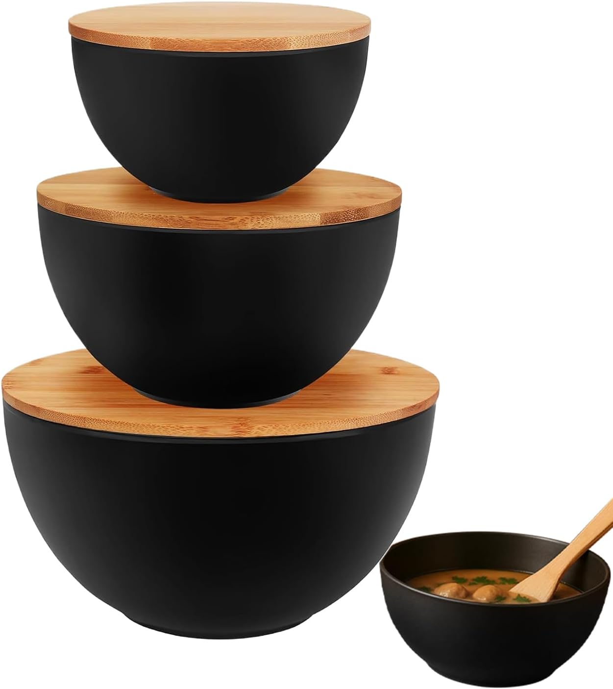 The bowls with lids are designed to simplify food preparation and storage in your kitchen. These versatile containers are ideal for holding a variety of foods, such as salads, fruits, chips, bread and vegetables. The stackable design ensures efficient use of space, making it easy to organize and store when not in use. Perfect for any kitchen, these bowls with lids help keep your food fresh and ready to serve, whether you need them for everyday meals or special occasions. Budget: Material: eco-friendly fiber + wood Size: about 25.5cm/10 inches about 20.3cm/8inch about 15.2cm/6inch Weight: 1750 g Product List: 1 x mixing bowls. Note: Due to different lighting and screen settings, the colour of the item may be slightly different from the picture. Due to different manual measurements, please allow 1-2 cm size difference.