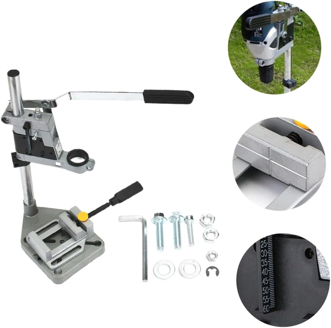 Package List 1 x bracket 1 x flat nose pliers 1 x wrench 1 screws Characteristics -Product Info: drill bracket - Adjustable clamping range: 38mm-42mm Bench Clamp Holder. - Material: Aluminum alloy, plastic, steel. - Size: About 50.00X14.50X14.50cm/19.65X5.70X5.70inch. - Color: Silver. - It can be used as a drill press, repair tool holder, and flex shafts holder Drill Press Holder. - and good craftsmanship ensure its durability and practicality. - This drill press rack is great in the activities like drilling, sanding, and buffing Drill Press Table. - Use this drill press stand for drills with diameter 38-42mm Table for Drill Press. - This drill press rack is a perfect tool for holding your drill tool steady during working Universal Drill Stand.Goods InformationDrill Press Floor Stand Adopted of , it is practical and durable for long time use.Drill Press is easy to use and bring you much convenience.Single Hole Drill Rack If you are looking for a professional and drill press stand, then your research is over here.Bench Clamp Support Tool That's because our product can meet your need