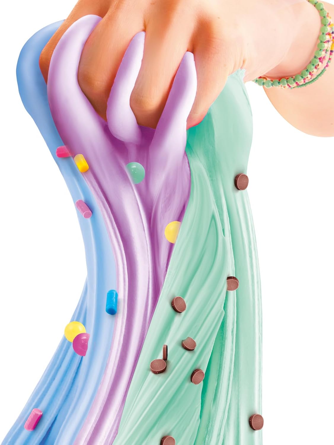 Create 3 fluffy slimes by mixing the powders with water and then add sequins or confetti. Three surprise minifigures inside.