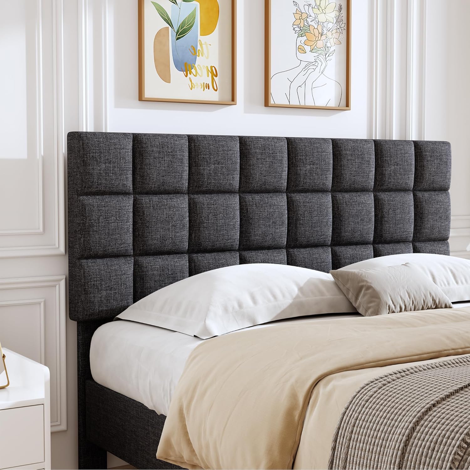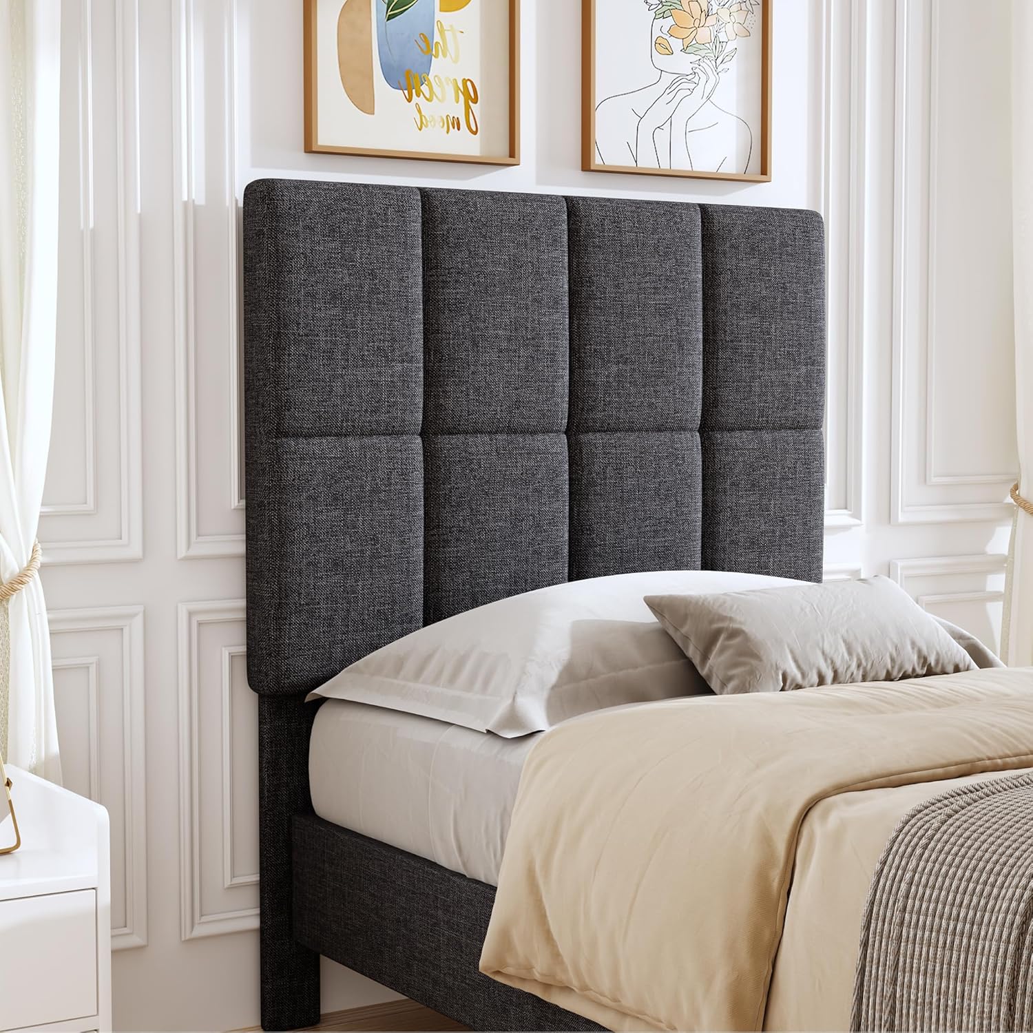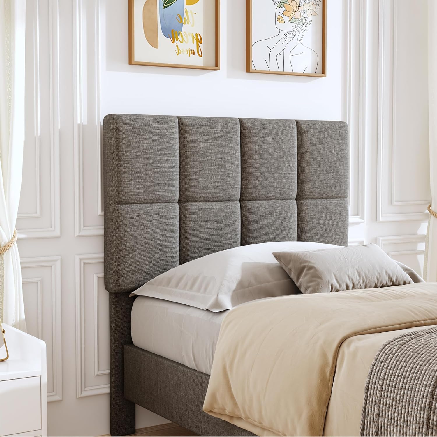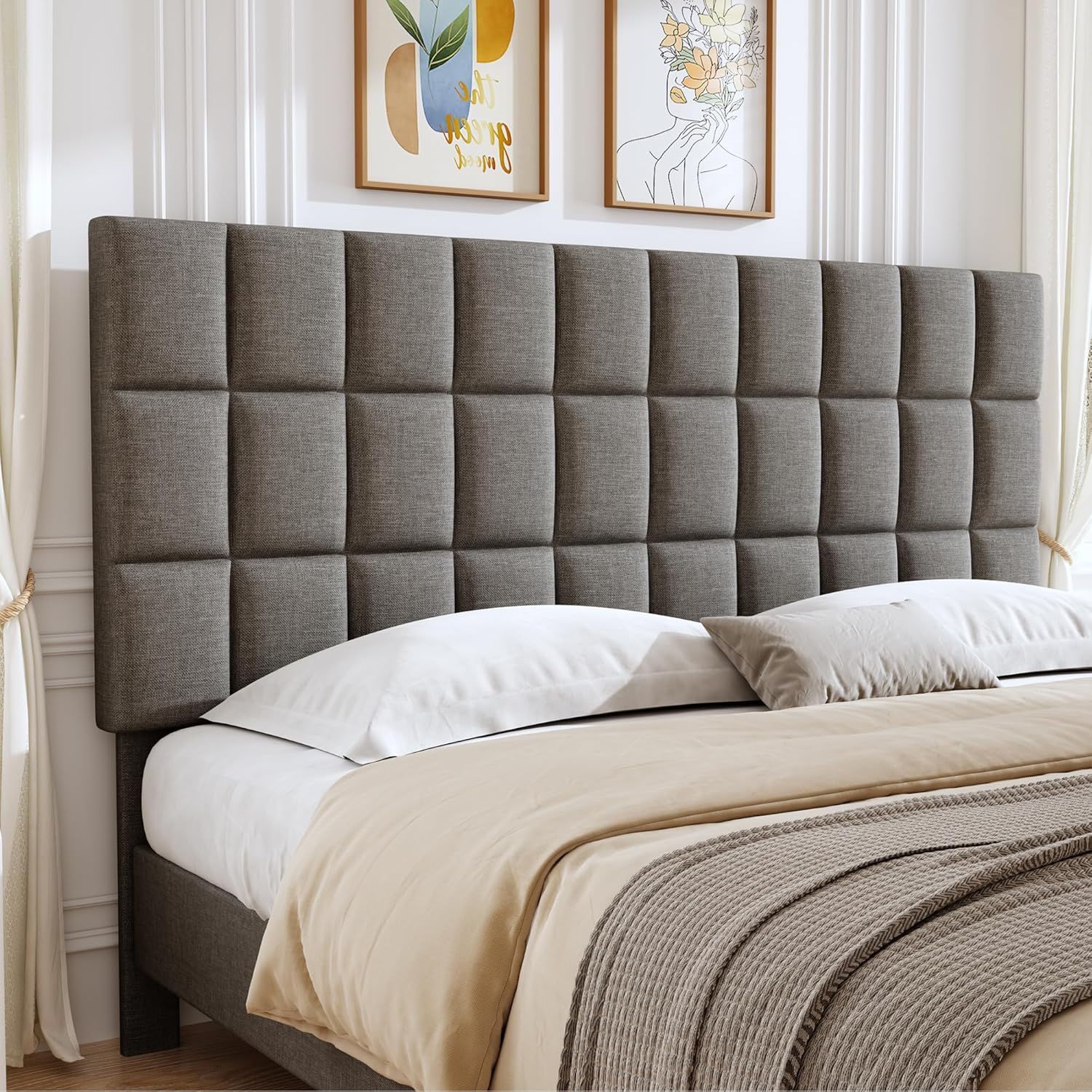 PDCOAK Square Tufted Linen Headboard Only, Upholstered Fabric Headboard, Durabl and Sturdy Solid Wood Bed Headboard, Grey