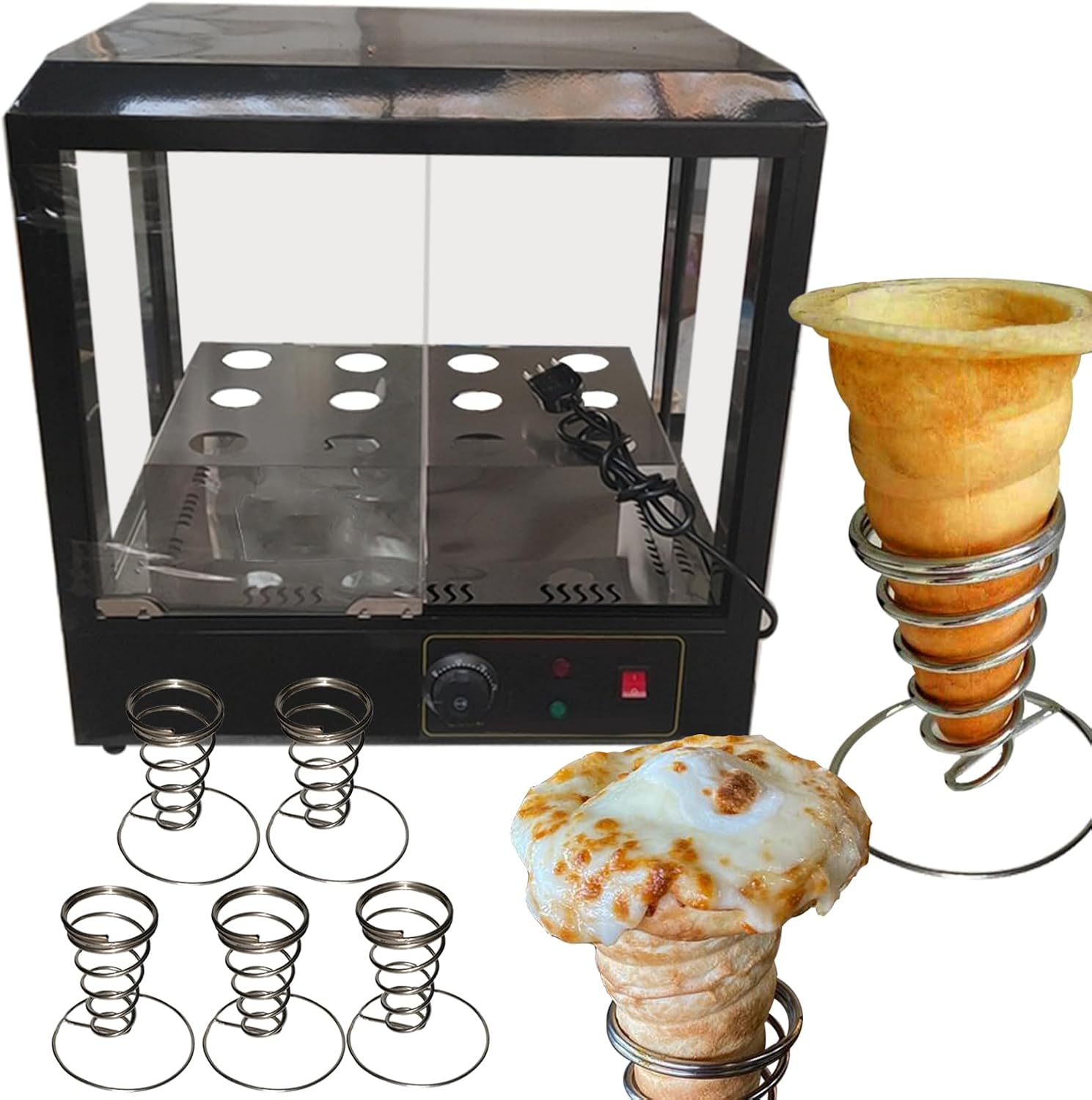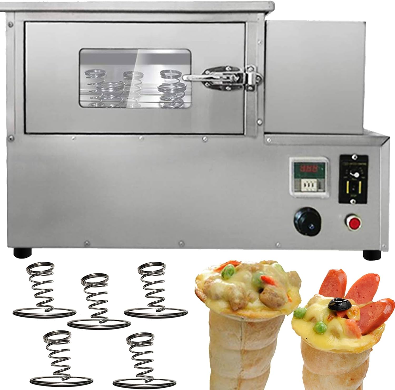 Parameters:This order includes 3 machines(This link includes pizza cone machine pizza oven and pizza display cabinet ) Specification:Model Number: PZ-4 Capacity of Work Bowl (Cup): 1000piece /h The quantity of mold: 4 molds nomal size:5.11*2.36*0.11inch/13*6*0.3CMAccessories: 5pcs pizza cone brackets Voltage: 110V /60HZ or 220V/50HZ Cone machine’s specification: Power: 3000w,Rated current: 27.2A(110V),13.6A(220V) Temperature Range: 0-572℉/0-300℃ Size of pizza machine: 20.86*13.77*38.58inch/530*350*980mm Pizza machine weight: 99.2LB/45kgOven machine’s specification: Power: 2000w,Rated current: 18.1A(110V),9A(220V)Temperature Range: 0-572℉/0-300℃ Size of pizza oven: 32.28*17.32*20.86inch/820*440*530mm Pizza oven weight: 88.18LB/40kg display warmer’s specification: Power: 600w,Rated current: 5.45A(110V),2.7A(220V) Size of display warmer: 20.47*20.47*15.35inch/52*52*39CM display warmer weight: 37.47LB/17kg with 12 holes and lighting Feature:1). The whole body of the machine is made of stainless steel, which is very environmentally friendly.Pizza Cone Machine Main Features1. Could adjust temperature according to different recipe. 2. The heating time of the mold can be controlled according to different dough. 3. The switch can control the production of the cone of the conical pizza.4.Flexible production: adjust the temperature of the top and bottom of the dies according to different pizza formula.5. Indicator reminder: There is an automatic alarm system inside the machine and the power light and the temperature indicator outside the machine. 6.Emergency preparedness: Press the emergency switch and then all the machine will stop working.Rotate Oven Machine Main Features:1. The machine has 4 heating rods, and it takes only 3-5 minute2. Can control the temperature 0-572℉/0-300℃, we recommend to control at 302-356℉/150-180 ° C.