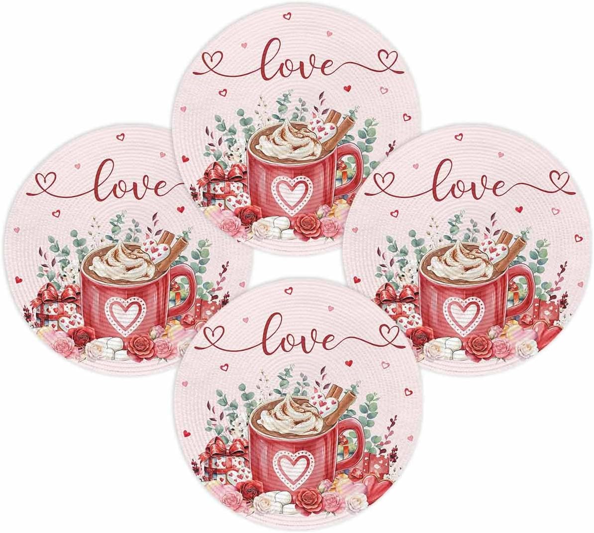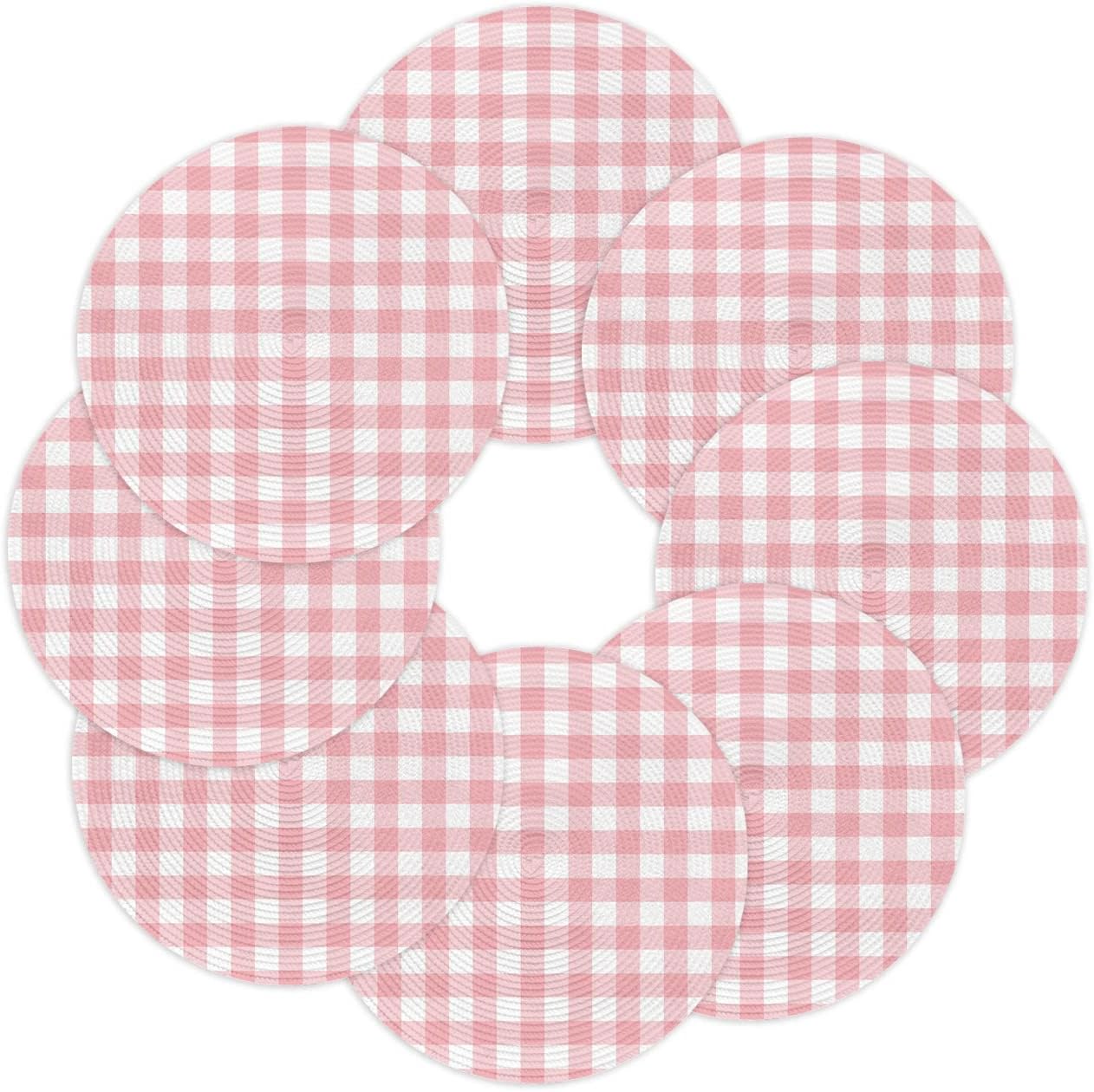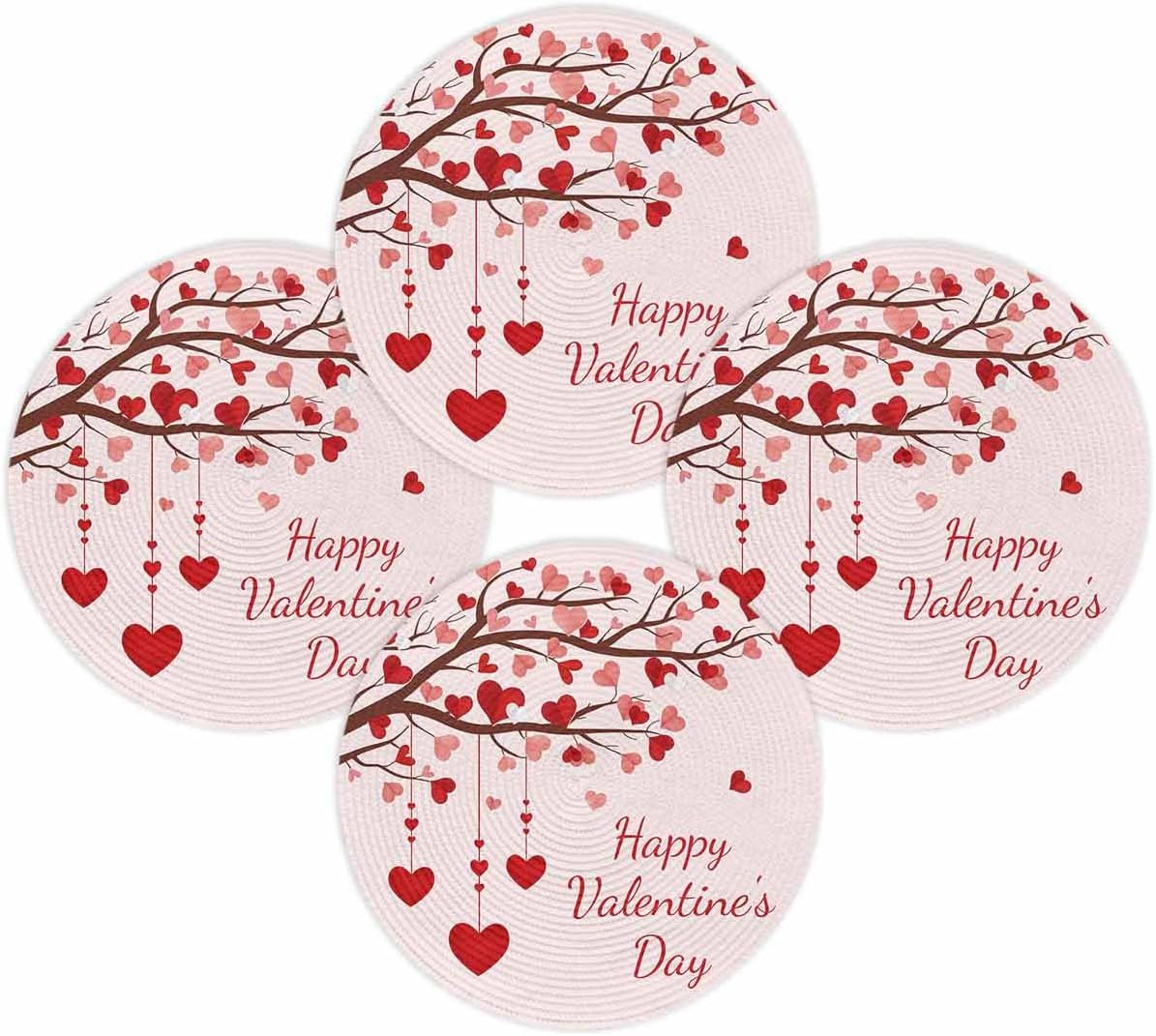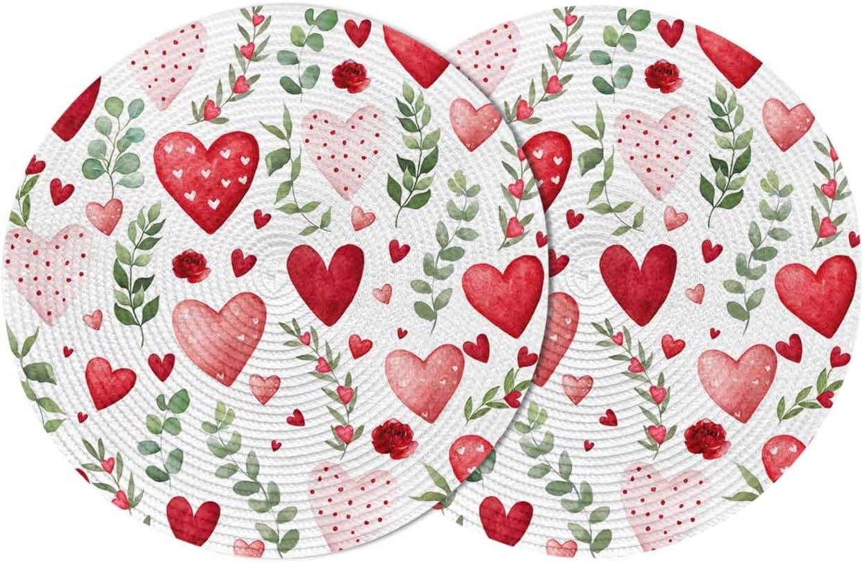 Valentine's Day Round Woven Placemats for Indoor Outdoor Seasonal Romantic Holiday Dining Table DecorGive an elegant decor touch to your home, and add a natural art aesthetic chic atmosphere.【Product Description】Package: Placemats Set of 2/4/6/8 PCSSize: Diameter 15 InchMaterial: Eco Friendly PolypropyleneMatches delicately and creates a unique lifestyle for your dining table, kitchen, garden, party, banquet, hotel, diner, reception, cafe, bar, picnic, BBQ, patio, any outdoor and indoor use.【Multiple Design Occasions】Adopting advanced digital printing technology, bright colors, and clear images, sturdy weave, overall elegant and beautiful.Our place mats come in a variety of vibrant colors and patterns full of natural aesthetic feeling for you to decorate your home.Our placemats set are durable, reusable, and exquisite. Great choice as a considerate and delicate gift for family members, couples, friends, and roommates.The high end placemats look elegant and stylish, and could be used for cups, plates, some tableware, cooking pots, potted plants etc, to meet your different needs. 【Warm Tips】Wipe clean with damp sponge or cloth. Both machine and hand washable with gentle cycle and lay flat to dry, no bleach, iron on low heat if required. The colors may have slight differences due to different screens.Due to the official package restrictions, placemats rolled up in the box, we suggest put some heavy things on the mats after unboxing, the crease will disappear and it will be flat.【Special Note】How to make the placemats flat?Unboxing → Crease the back → Turn over the placemats opposite → Make the front side up → Put heavy things on it → After a while, they will be flat