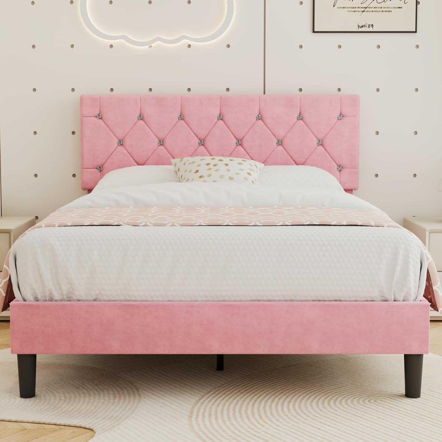 “ Why You Choose Upholstered Beds”**Comfort - Upholstered beds provide extra padding and cushioning for a cozy feel. The soft, padded headboard makes sitting up in bed more comfortable.Style - Upholstery allows for more design options with different fabrics, colors and tailored details like tufting, nailheads, etc. This allows you to match your bedroom decor.Durability - Quality upholstery is durable and will hold up well over time compared to bare wood or metal frames. Padding helps protect the frame too.Noise Reduction - Upholstery muffles noise and prevents squeaking or rattling sounds that can come from metal or wood frames.Customization - Upholstery can be added to basic bed frames to give them a customized, upgraded look and feel. You can reupholster over time too.**So in summary, upholstered beds provide extra comfort, stylish design, durability and noise reduction compared to non-upholstered basic frames. The padding gives a cozier, tailored look.Specifications of Our Upholstered Bed frame- Material: Velvet, Wood, Sponge, Metal- Style: Button Tufted Platform Bed Frame- Weight Capacity: Twin (550 lbs), Full (800 lbs), Queen (800 lbs)- Package Size:Twin Bed Frame: 43.3 x 22 x 5.5 InchFull Bed Frame: 58.3 x 22 x 5.1 InchQueen Bed Frame: 64.6 x 22 x 5.1 Inch- Package Weight:Twin Bed Frame: 58.3 lbs/ 25.5 kgFull Bed Frame: 64.6 lbs / 30 kgQueen Bed Frame: 70.5 lbs / 32 kg- Package Content:All accessories of bed frame4*4 mm L-shaped Allen KeyInstructionWhat We Support For YouFree-shipping30-days Free ReturnWe understand that unforeseen circumstances can occur during transit. If you happen to receive any damaged accessories, please e-mail us!Tips- Please read the instruction carefully before the assembly, ensure all parts and screws are firmly attached before use.